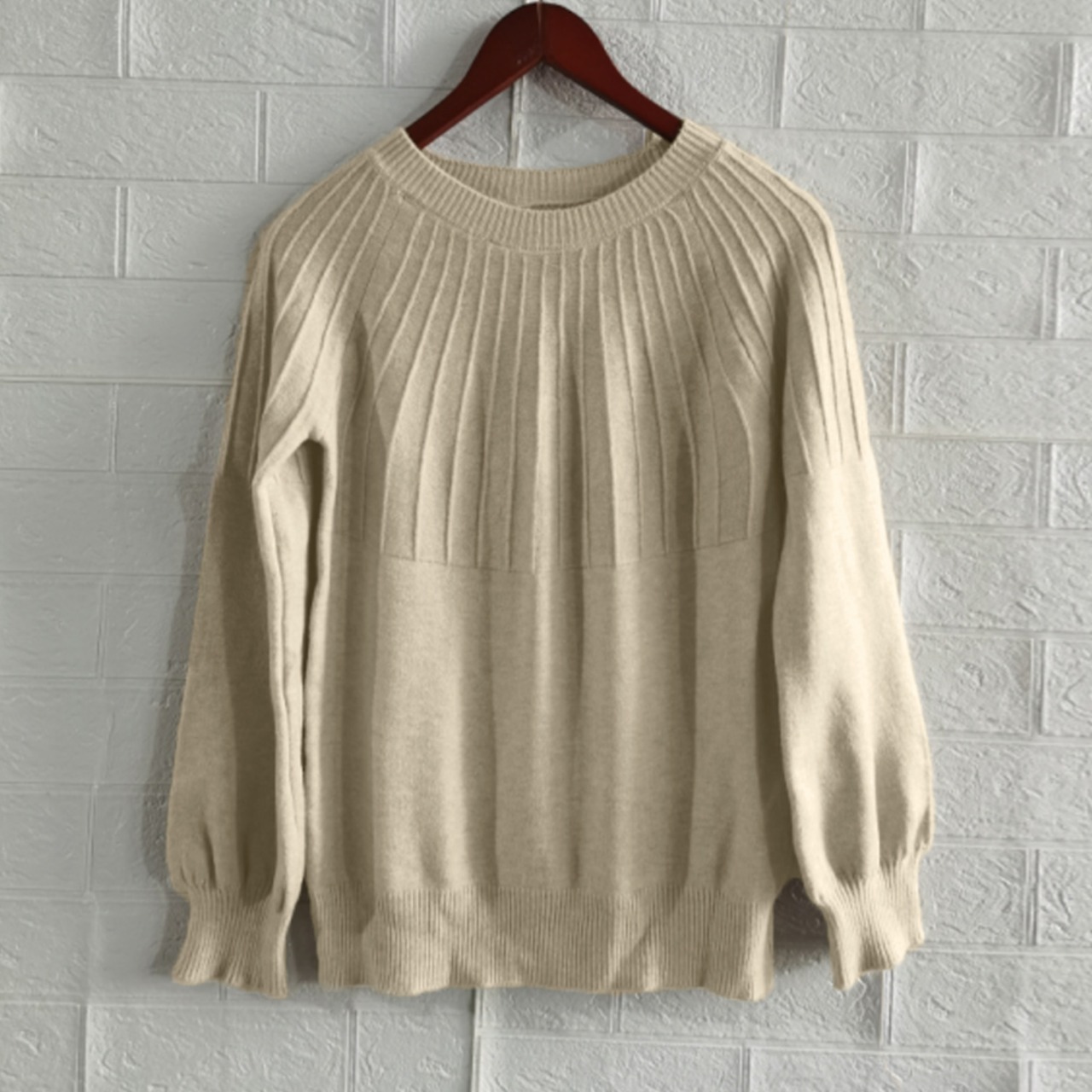 ゆとりのあるシルエットながら求心編みが首元をすっきりと華奢みせしてくれるデザインのニットプルオーバー