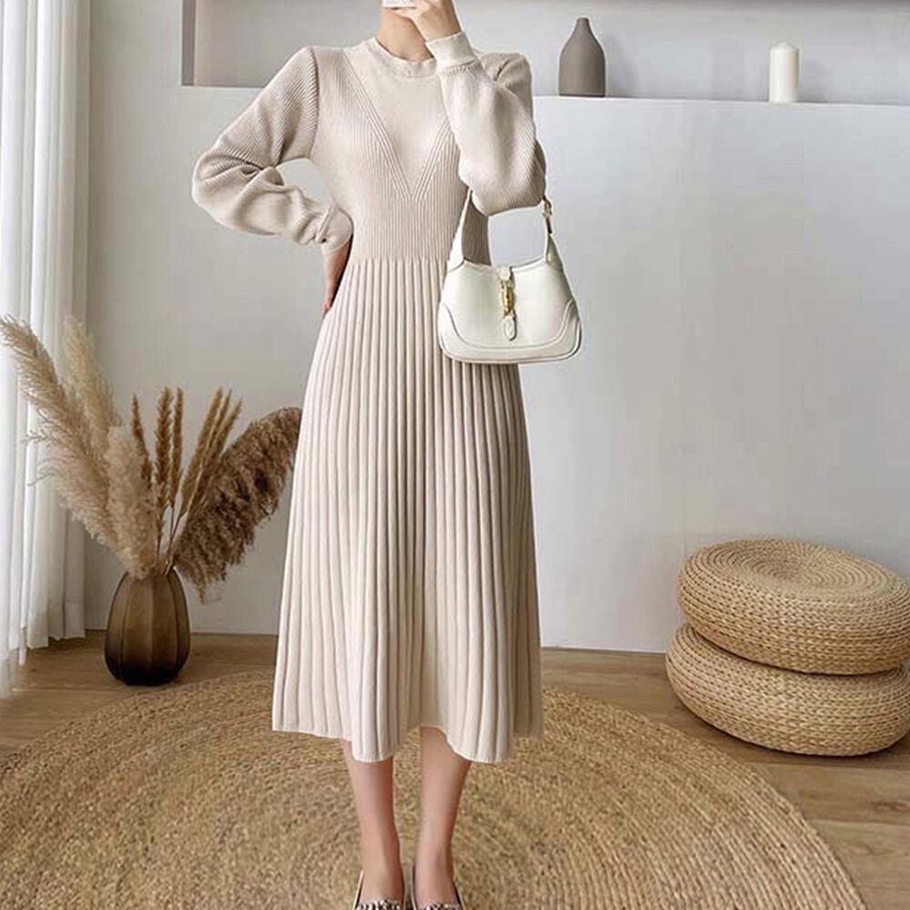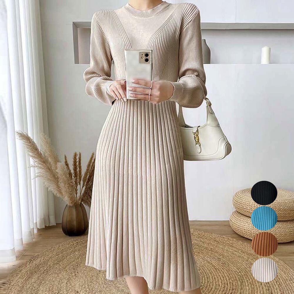 フェミニン 膝下ワンピース ラウンドネック おしゃれ 長袖ワンピ きれいめ プリーツワンピース Aライン 無地 きれいめ