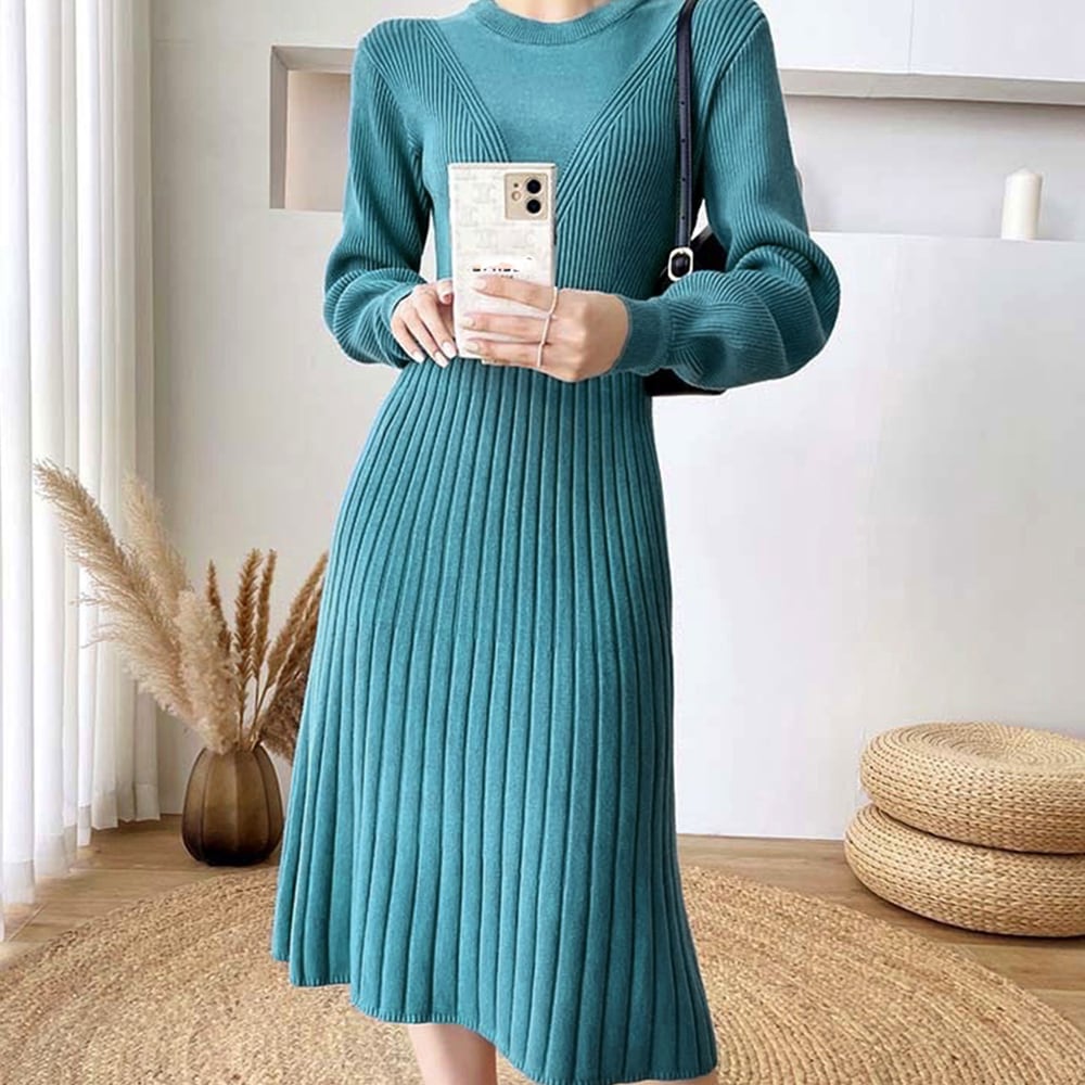 裾に向かって広がるフレアシルエットで女性らしさをプラスしてくれるリブニットワンピースです