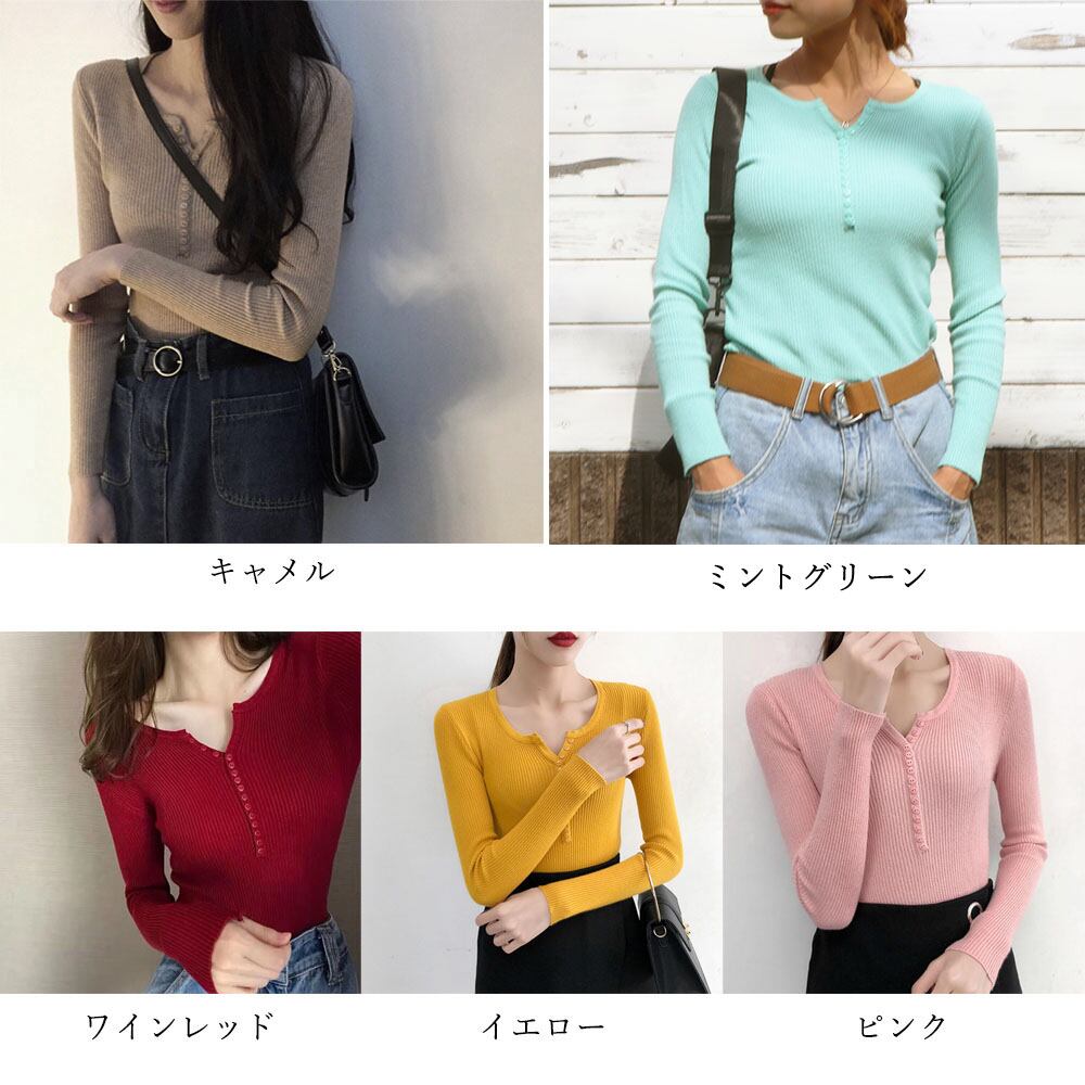 vネック タイトトップス シンプル ニットソー 無地 着回し フロントボタン インナーセーター 秋冬