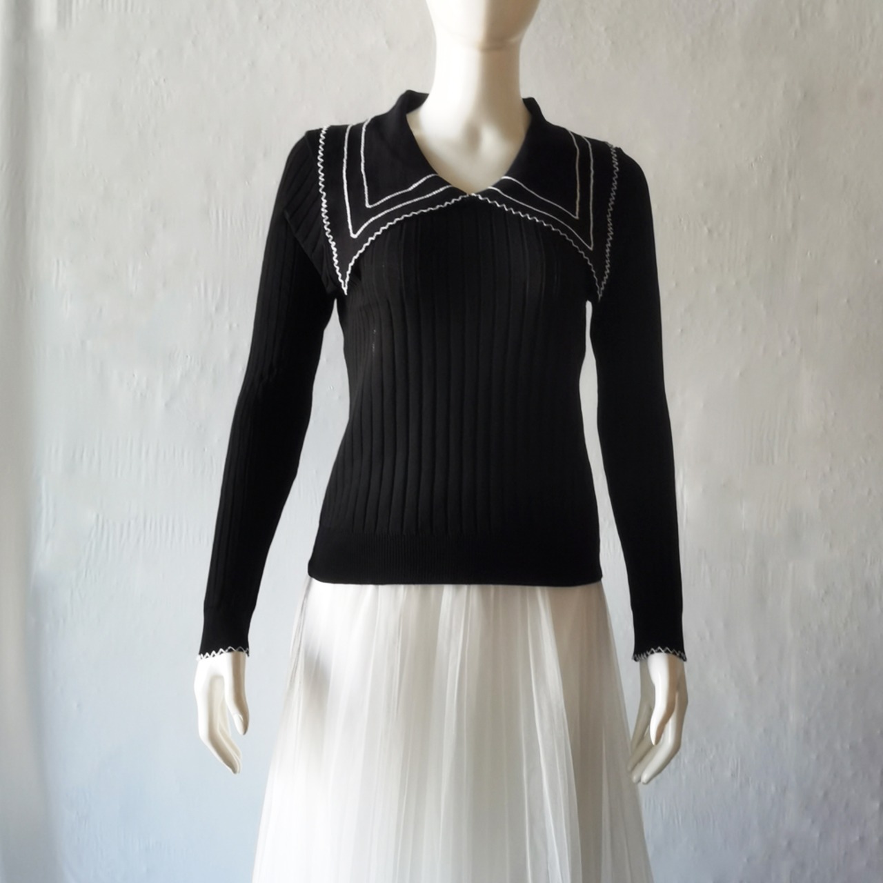 リブニットトップス 長袖 襟付きニット