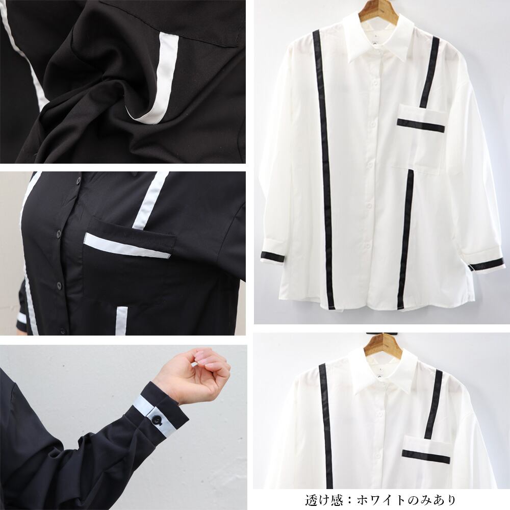 バイカラー 開襟シャツ 着やせ おしゃれトップス カジュアル ライン入り カーディガン ゆったり ロングシャツ体型カバー