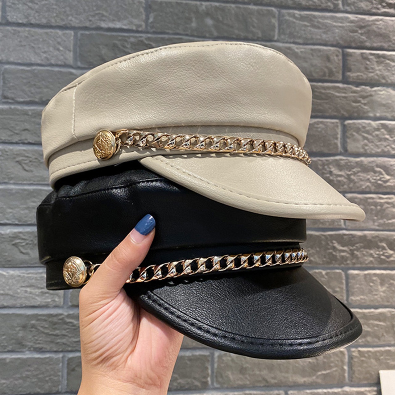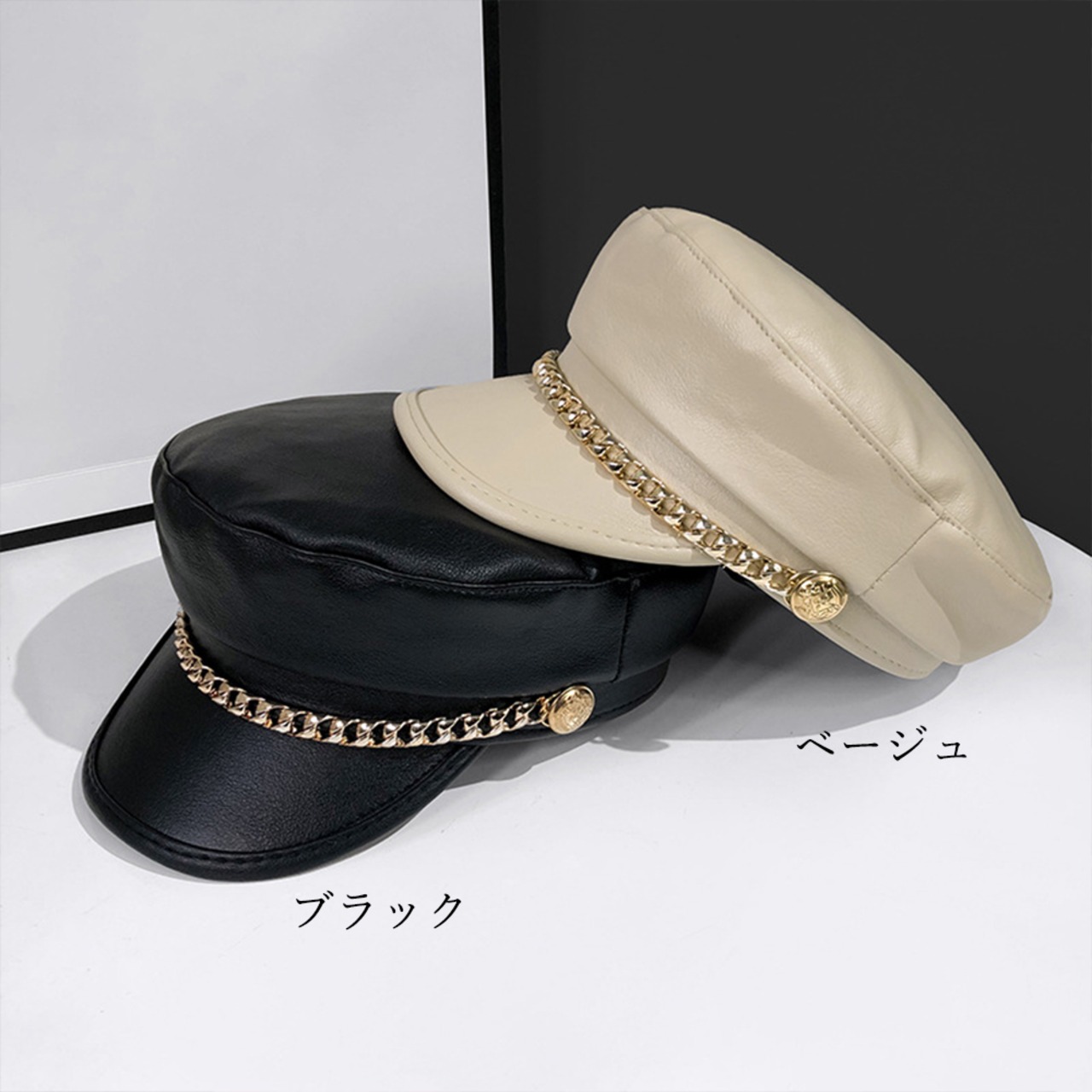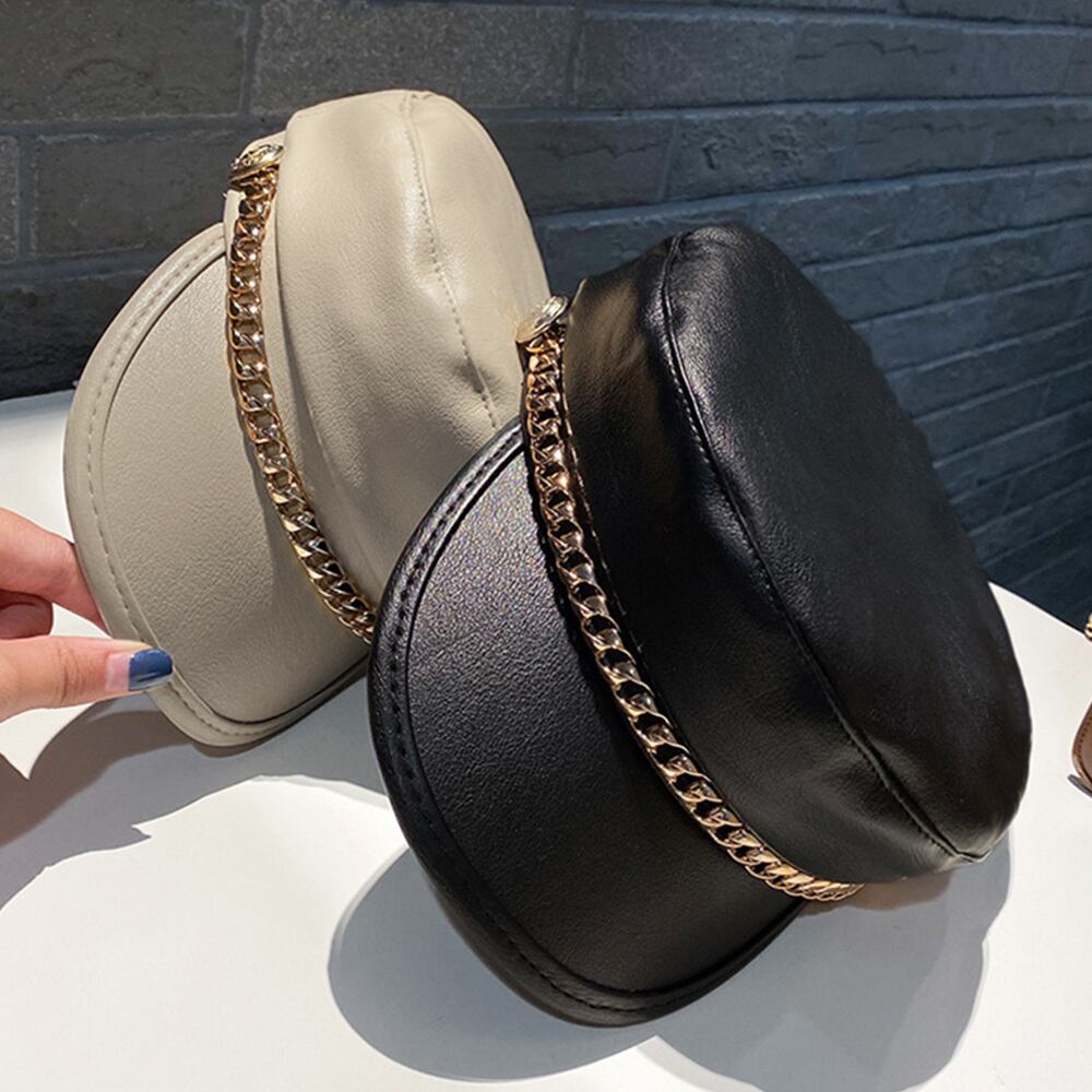 フェイクレザーキャスケット チェーン付き 帽子 合皮キャップ マドロスハット マリンハット PUレザーキャップ秋冬女の子