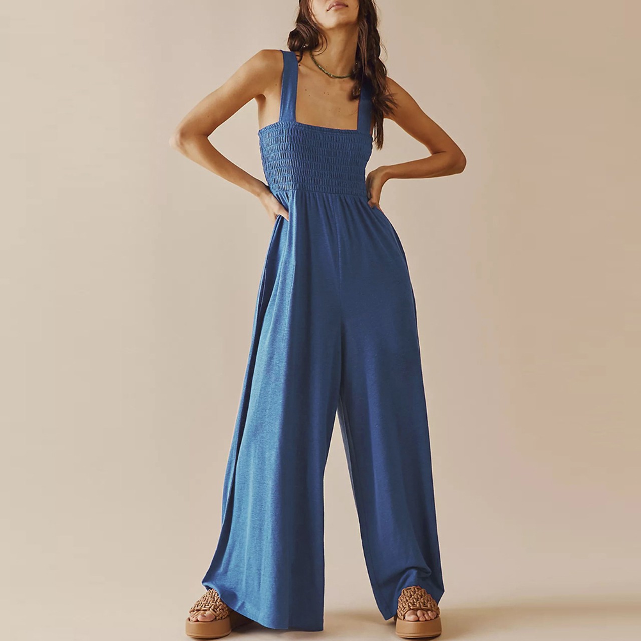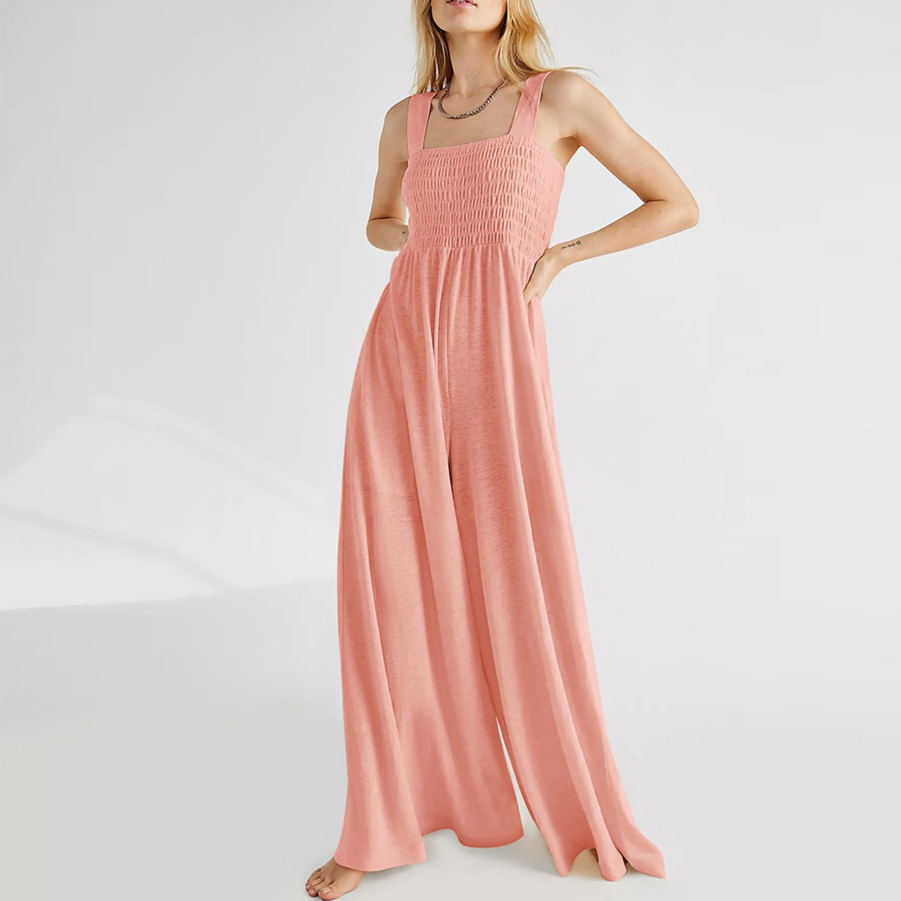 着やせ サロペット 無地 フレアパンツ リゾートワンピース