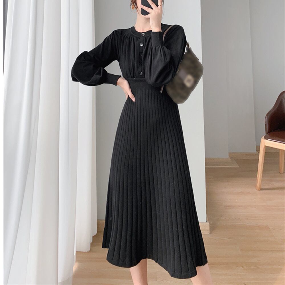 ミモレ丈ワンピース クルーネック 長袖 パフスリーブドレス エレガント 秋冬通勤 大人 ハイウエスト ワンピース 無地