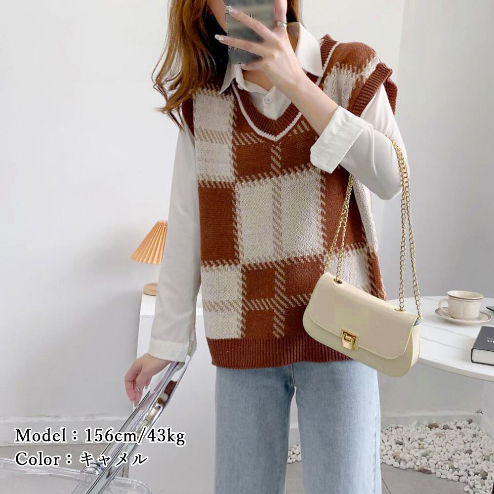 総柄ベスト レディース ニットチョッキ 重ね着 学院風 通学 レイヤード風 秋冬コーデ ニットカットソー プルオーバー秋