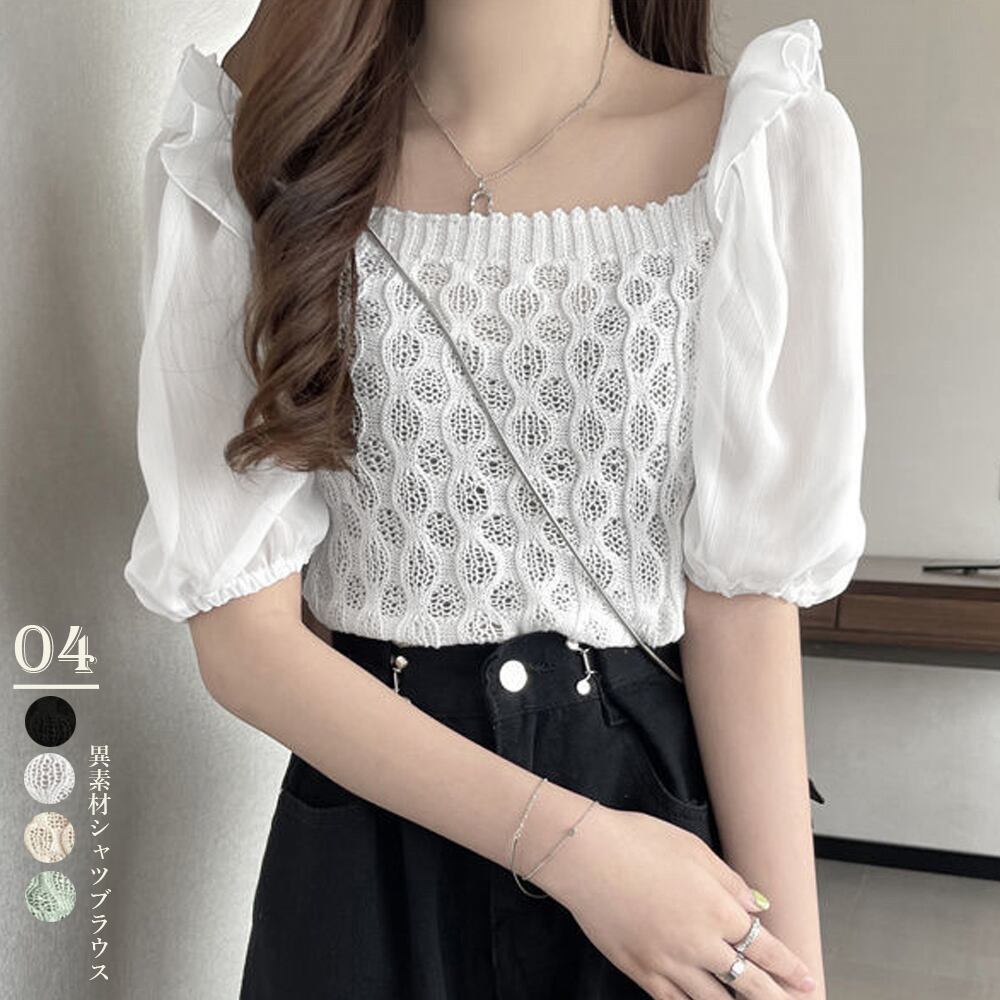ドッキングシャツ 異素材ミックス パフスリーブ ニットブラウス 韓国風 ショート丈 ニットトップス 春夏 大人可愛い