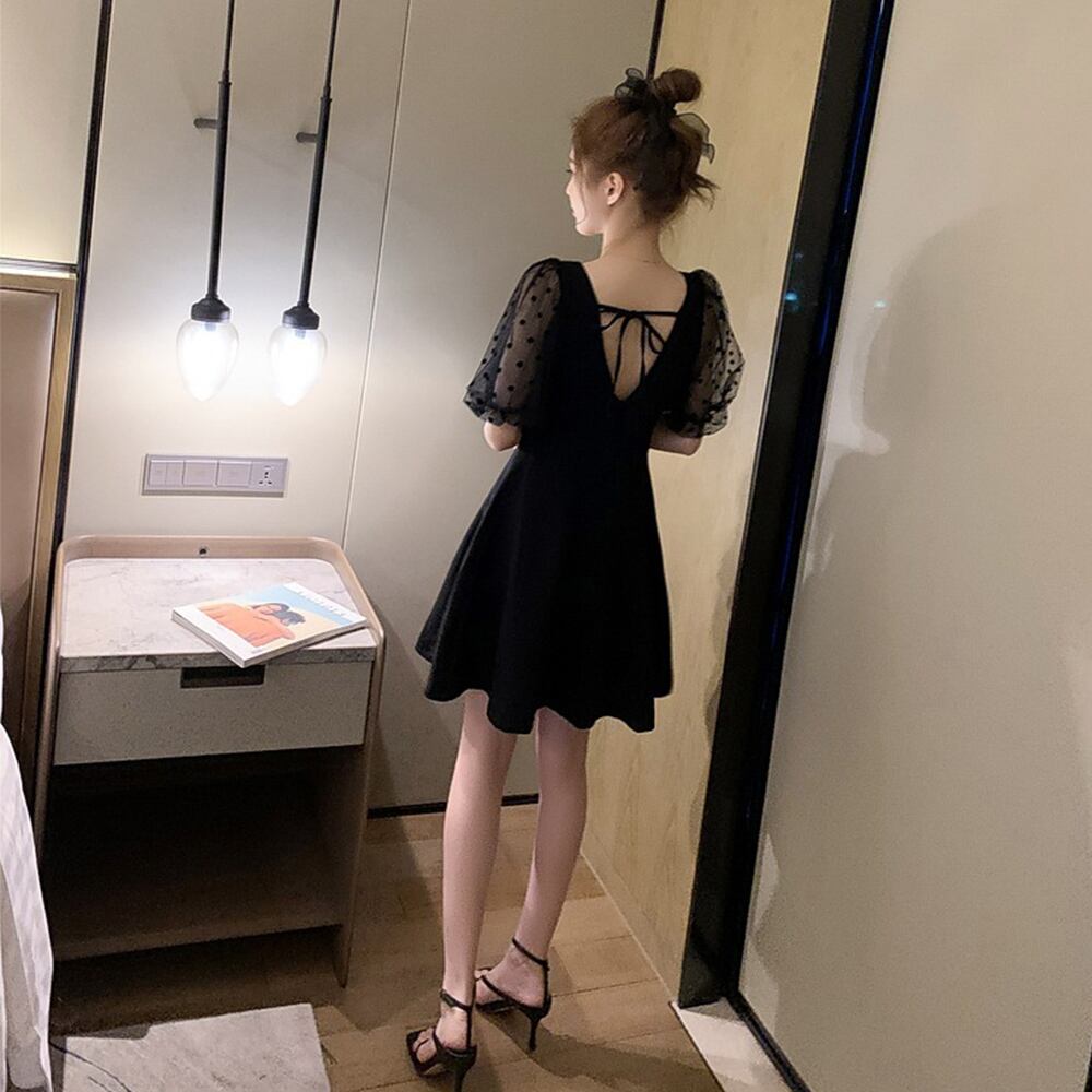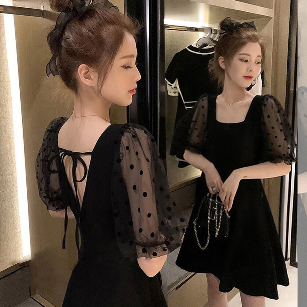 aラインワンピース 大人可愛い フレアワンピ スクエアネック 着やせ パフスリーブ ドットチュール袖ショート丈ワンピース