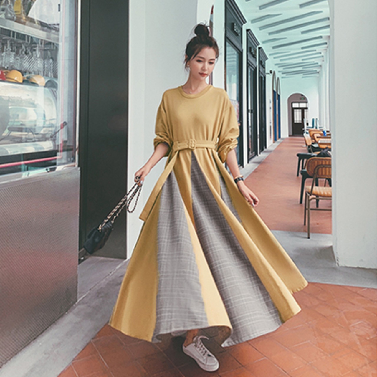 レディース オシャレ Aラインワンピース クルーネック 長袖 ウエストマーク 配色ワンピ 体型カバー 着やせ 大人