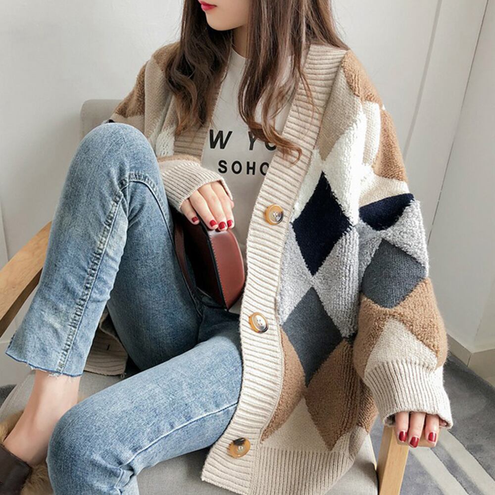 アーガイル柄 ニットアウター vネック 中厚手 長袖ニットソー 体型カバー羽織 お洒落カーデ カジュアル 女子ニット