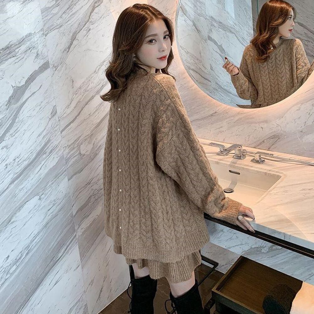 もっちり起毛のニット生地に立体感のある前後ケーブル編み仕様、オトナガーリースタイルの上下2点物のニットセットアップ