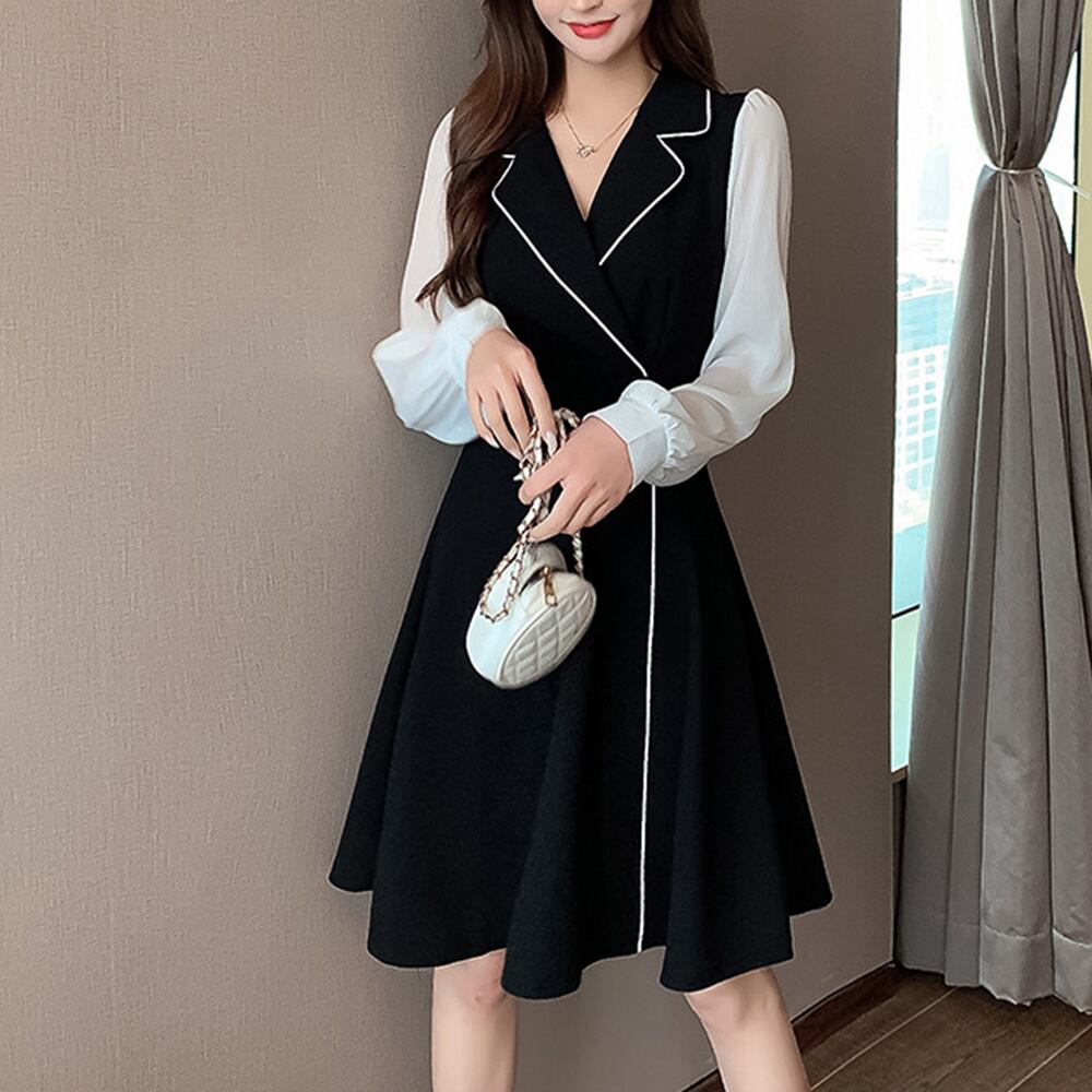 ドレスワンピース ウエストマーク ドッキング aラインワンピース 膝丈 きれいめ 長袖 襟付き ワンピース 大人可愛い