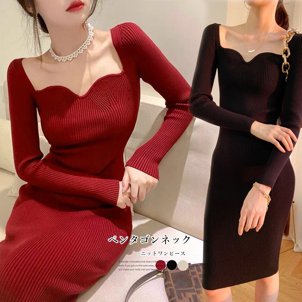 ボディーラインを強調してくれるペンタゴンネックニットワンピース