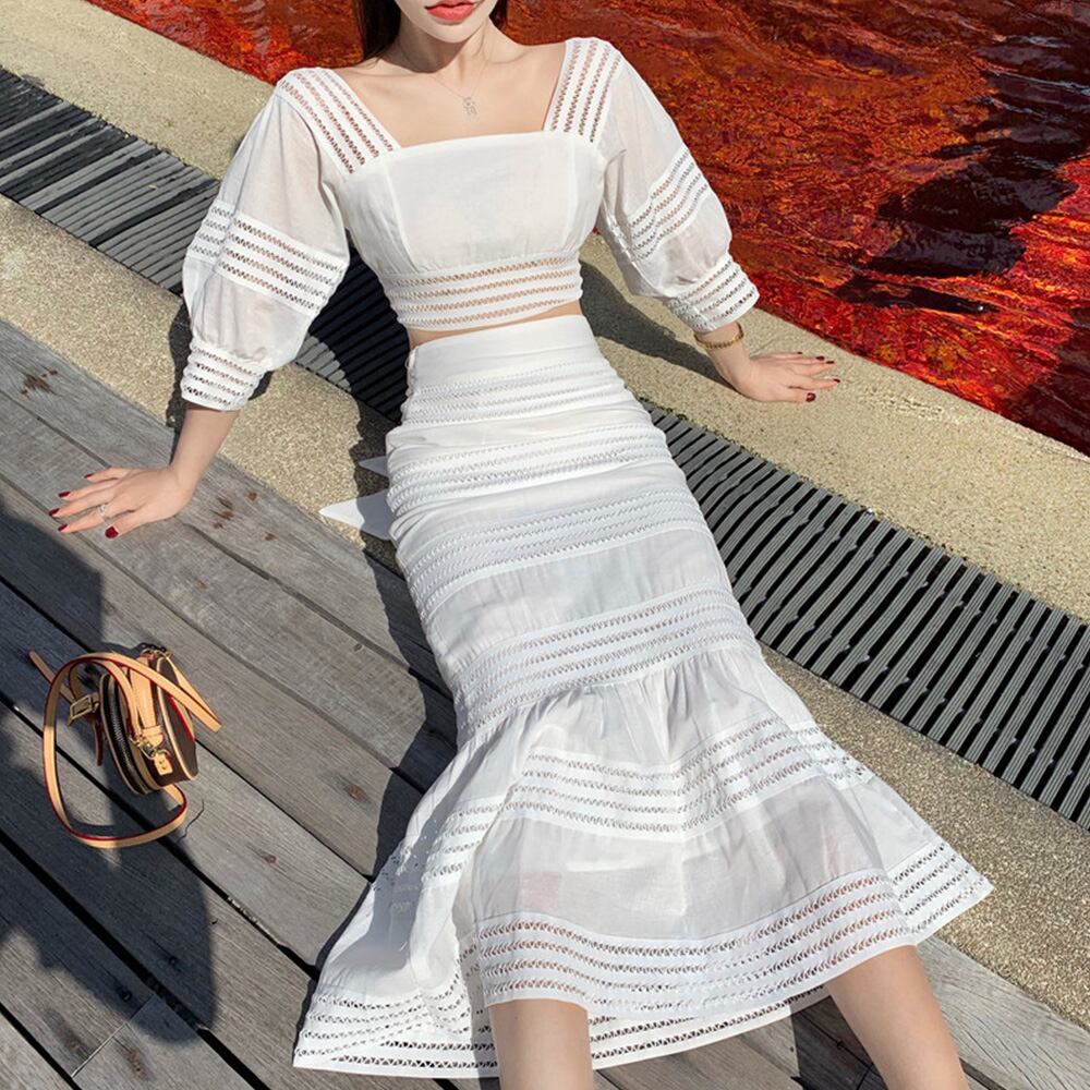 ショート丈 トップス ハイウエスト ロングスカート 上下セット スクエアネック ブラウス リゾートドレス リゾート 春夏 背中あき へそ出し バックリボン高みえ