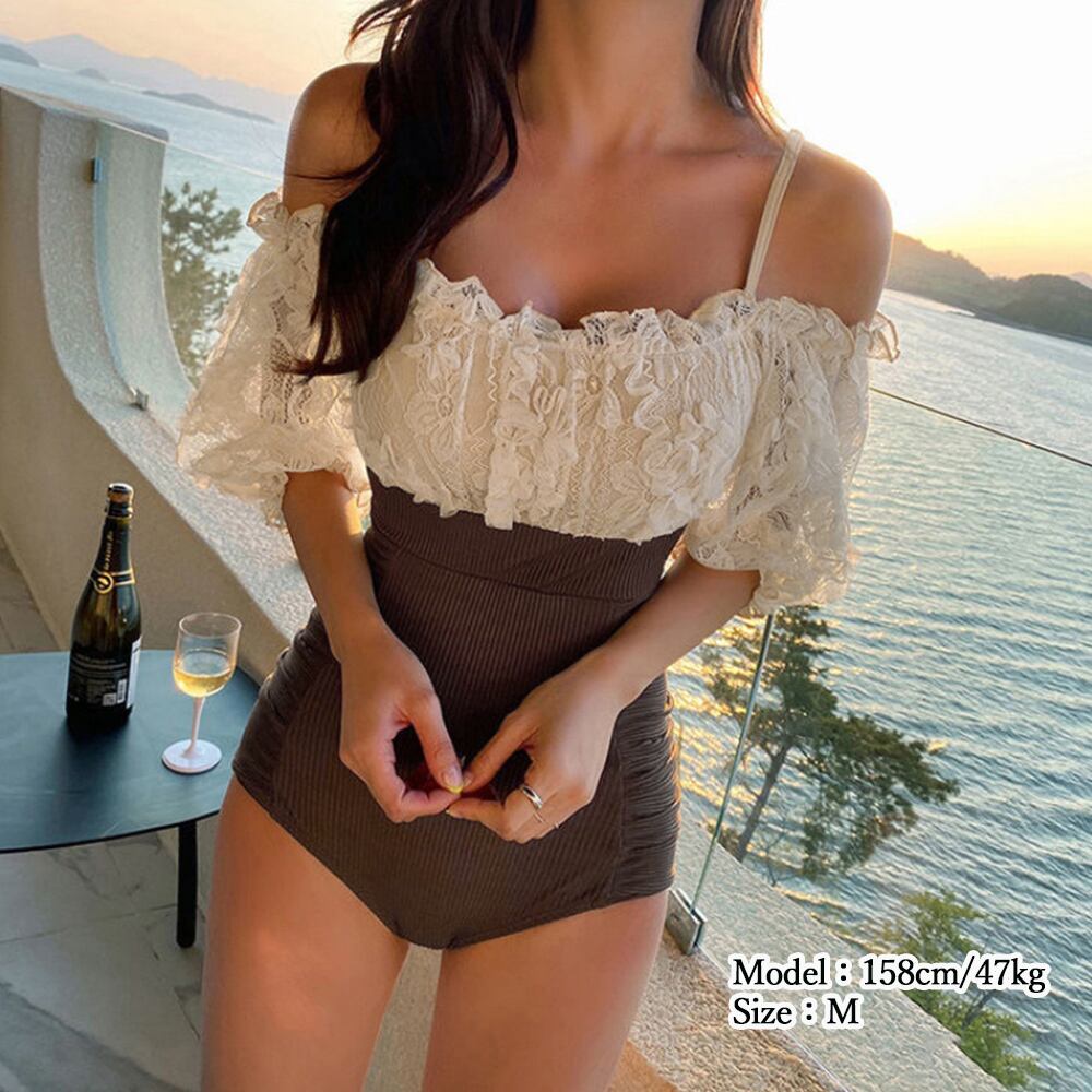 背中レースアップ ハイウエスト水着 オフショルダー スイムウェア セクシー リゾート 半袖 レース水着 韓国 盛れる水着