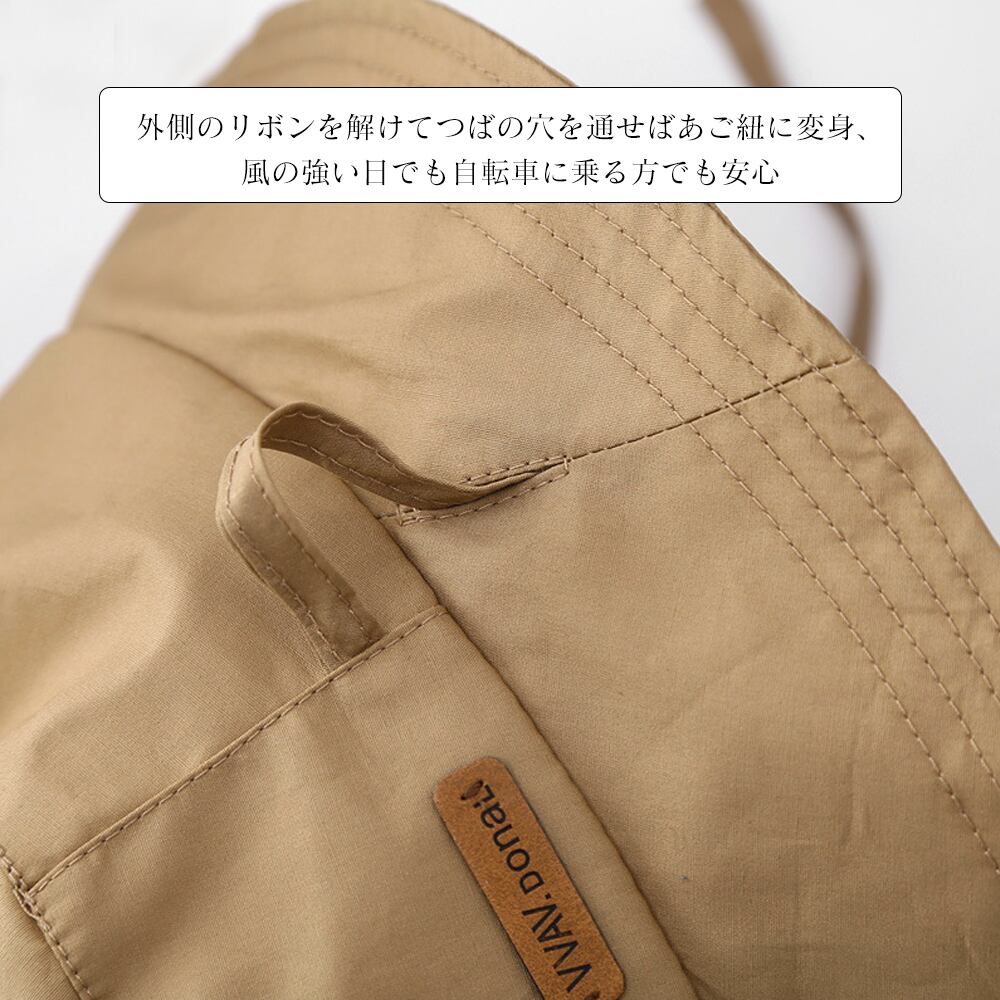 外側のリボンを解けてつばの穴を通せばあご紐に変身、風の強い日でも自転車に乗る方でも安心