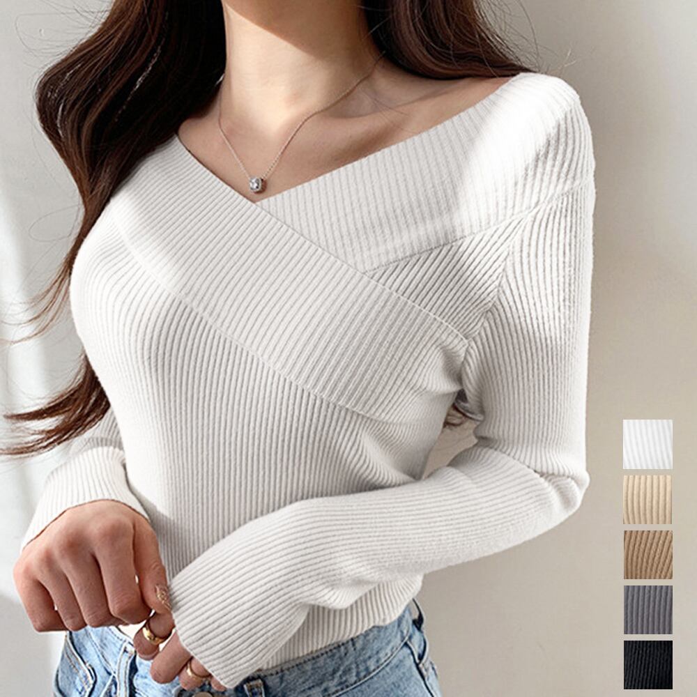 レディース リブニット ニットセーター 無地 長袖 クロス 鎖骨見せ セクシー お洒落 着やせ 大人 可愛い オルチャン