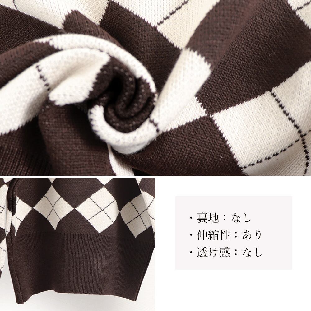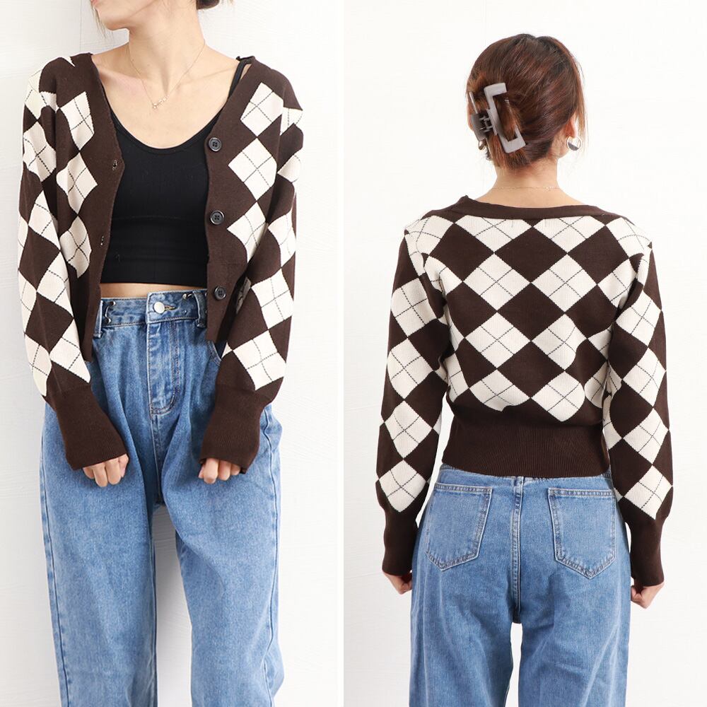 レトロな印象のアーガイルチェック柄が目を惹くニットカーディガン