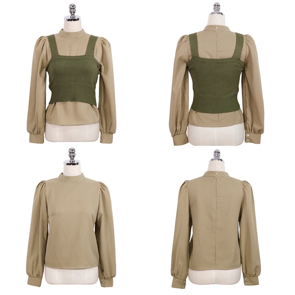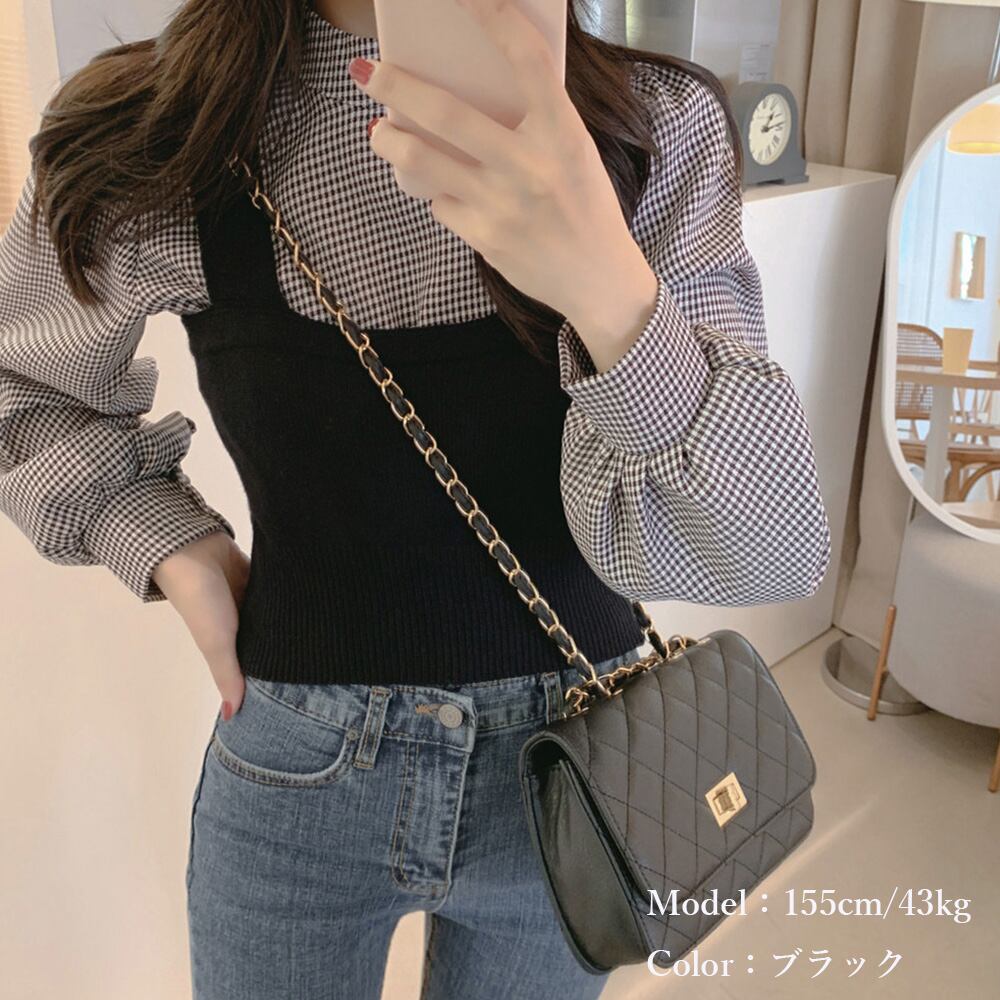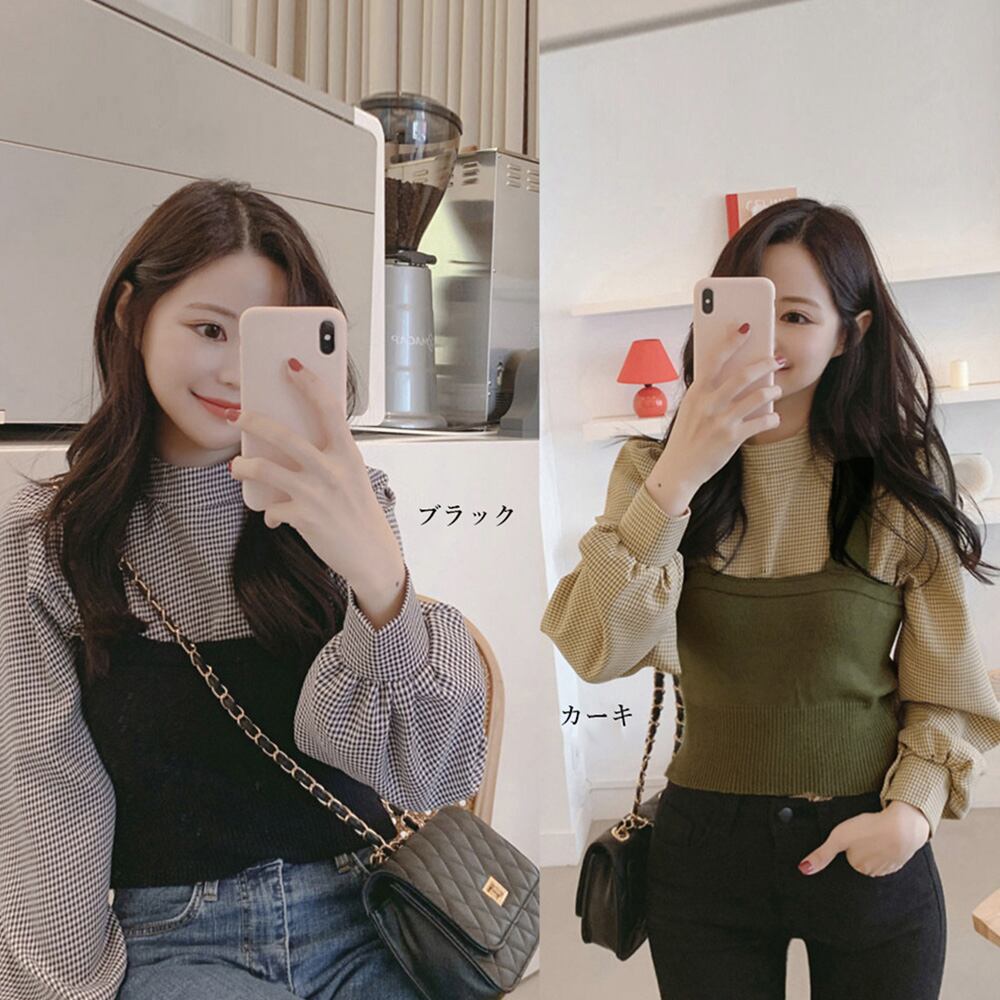 ニットキャミソール ブラウス2点セット レディース チェック柄 長袖シャツ