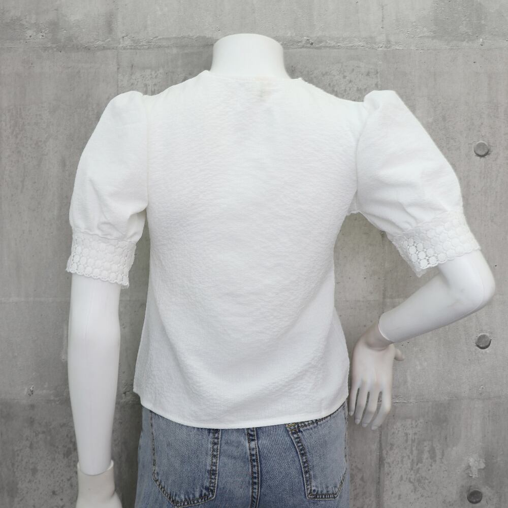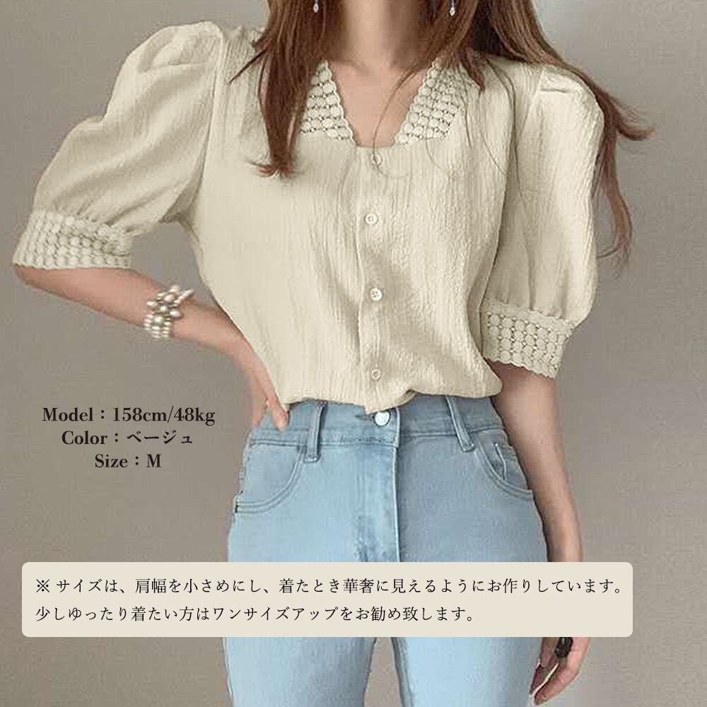 半袖シャツ 透け感 薄手 Vネック パフスリーブ 刺しゅう 着やせ オルチャン 大人 カジュアル お洒落 可愛い