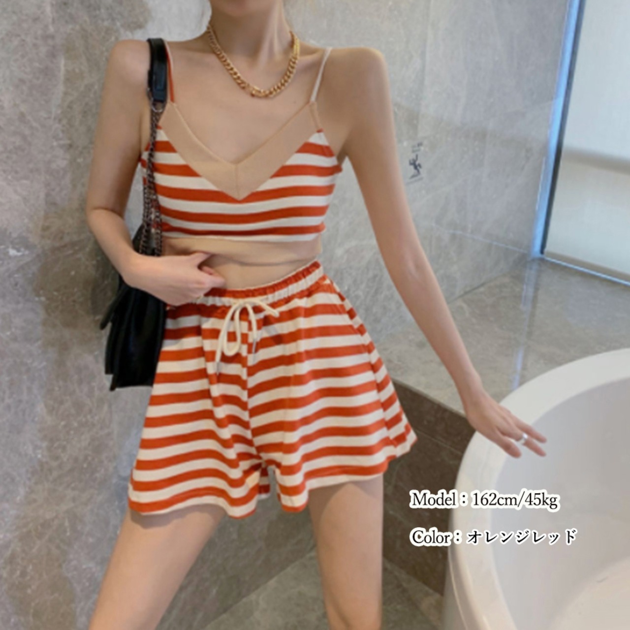 可愛いボーダー柄キャミソールとショートパンツのセットアップ