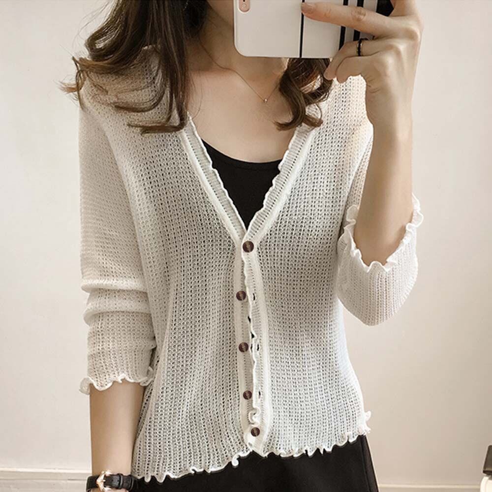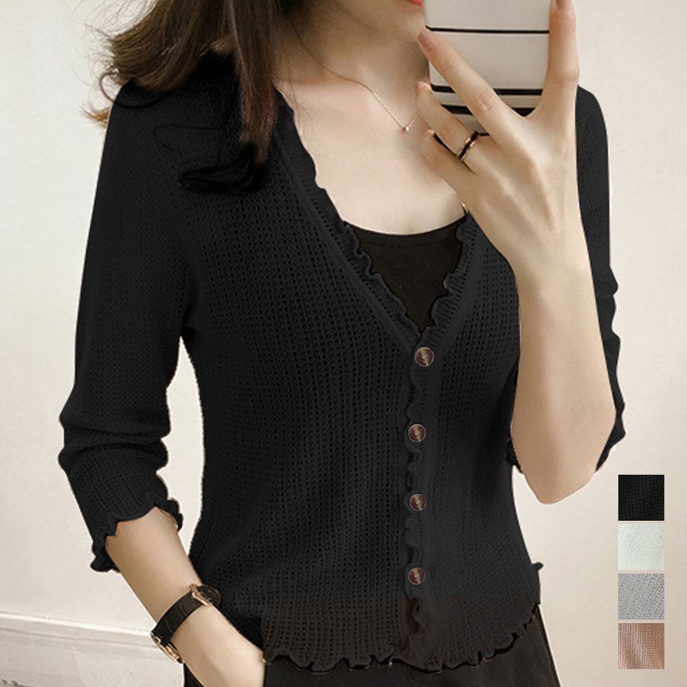 フリルが可愛い、Vネックサマーニットカーディガン