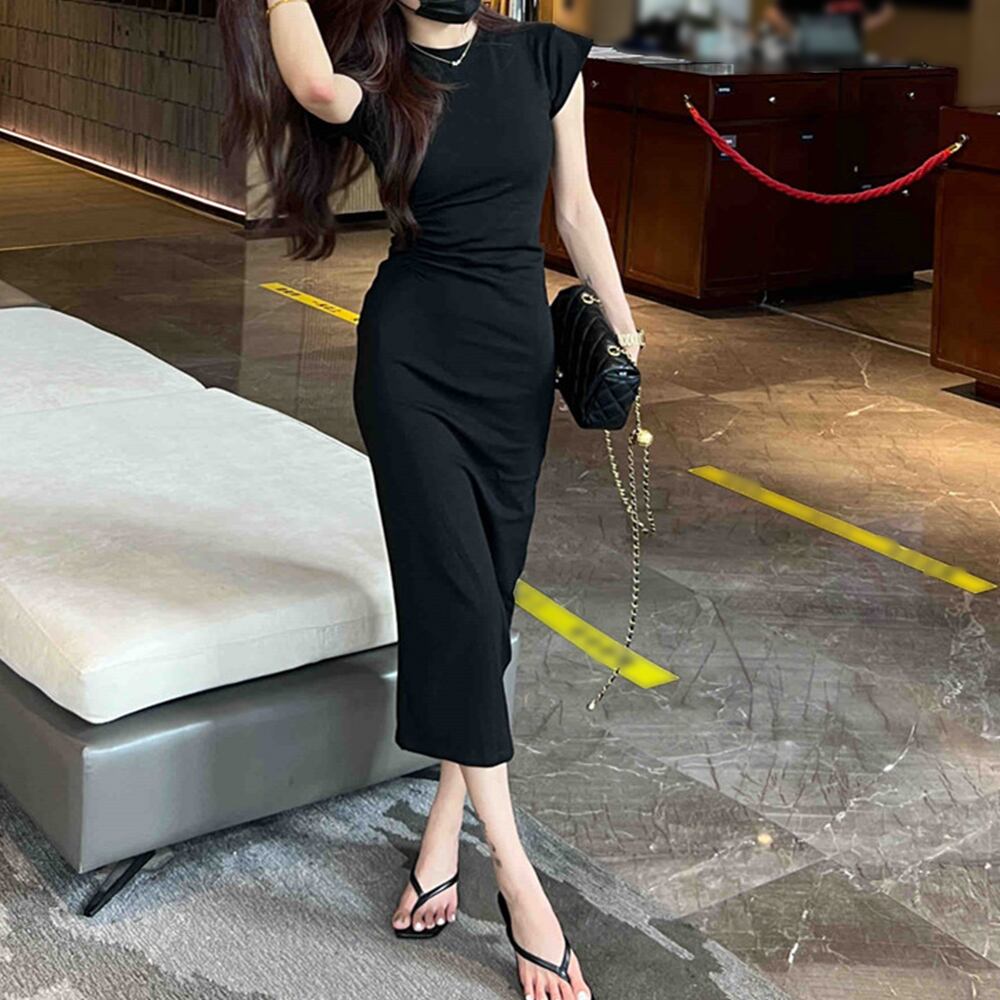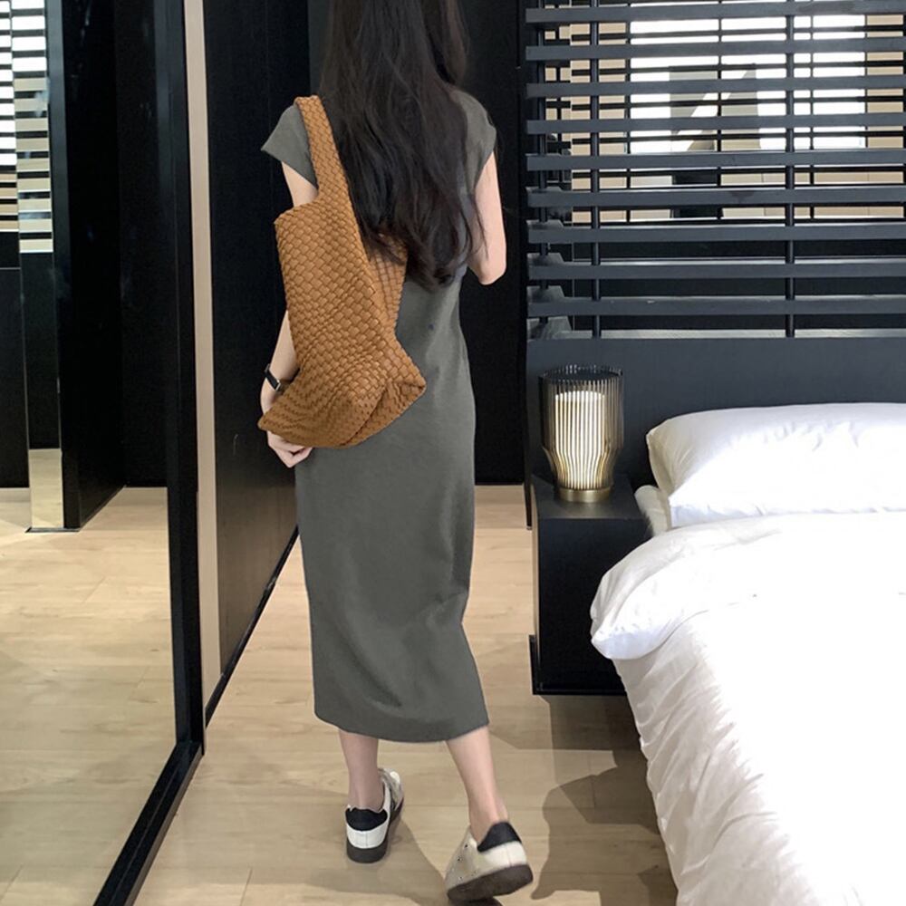 レディース 夏ワンピース フレンチスリーブ きれいめ カットソーワンピ細身 クルーネック 無地ワンピ フェミニン スリム