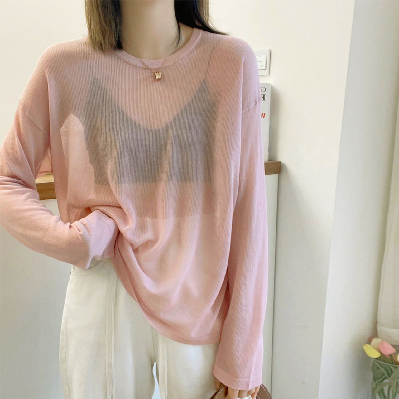 薄手 プルオーバー ゆったり シースルートップス 冷房対策 透け感 丸首カットソー 韓国 UV対策 ニットTシャツ 無地