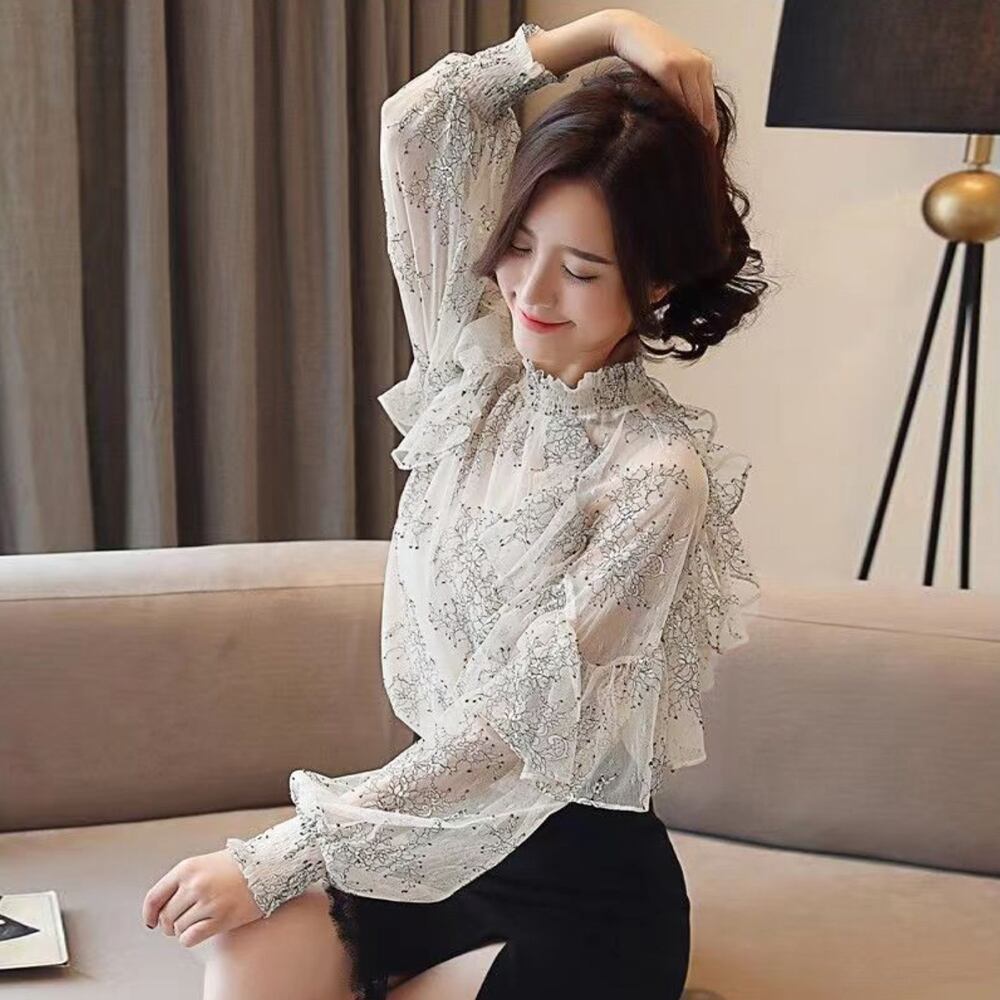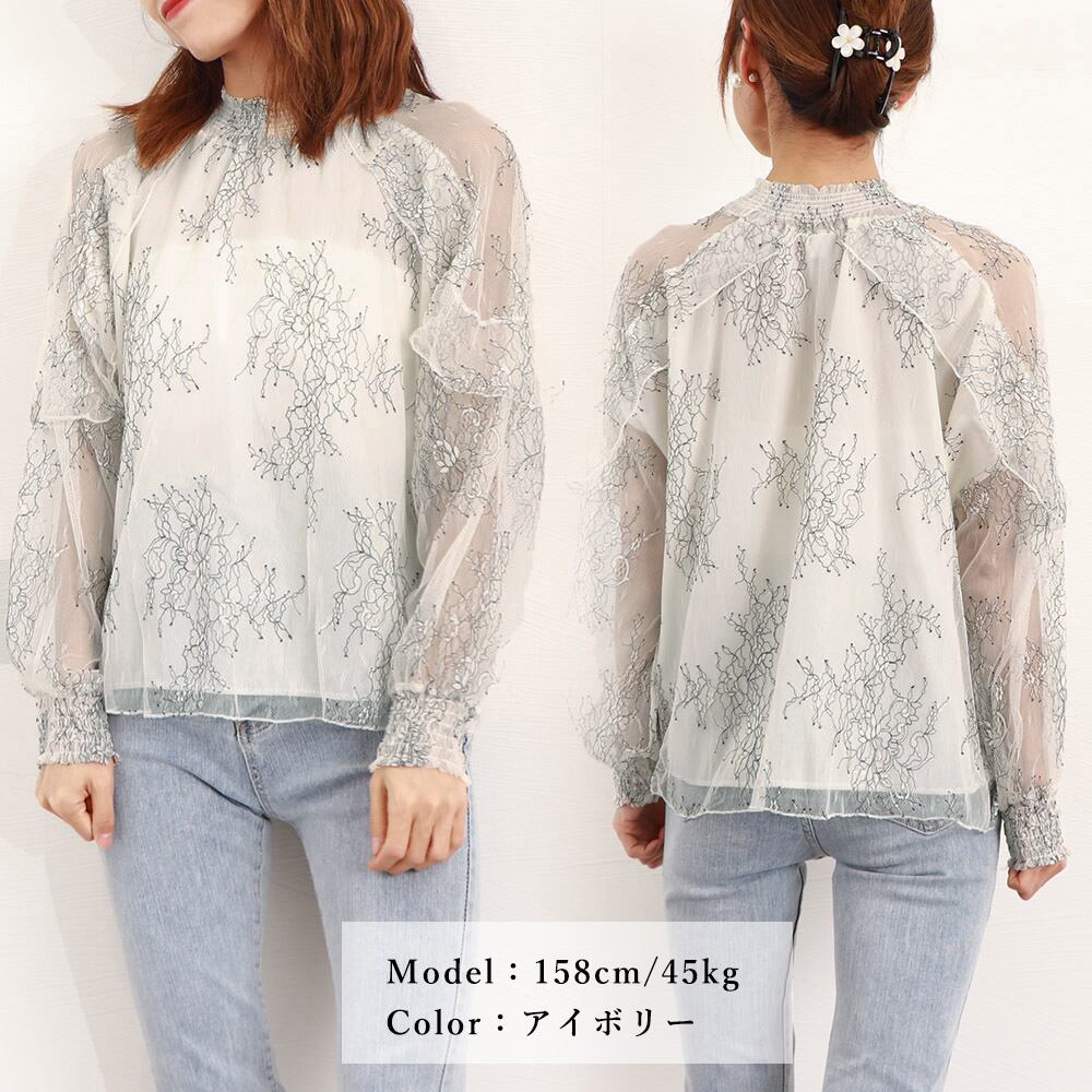 フリル フレアトップス 透け感 肌見せ 大人可愛い花柄ブラウス ハイネック ぽわん袖春夏長袖 薄手ブラウス 韓国おしゃれ