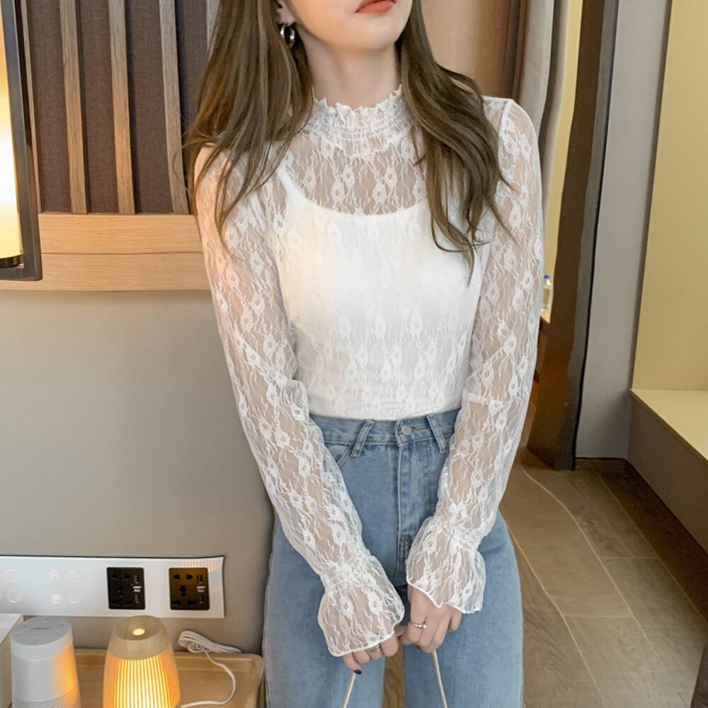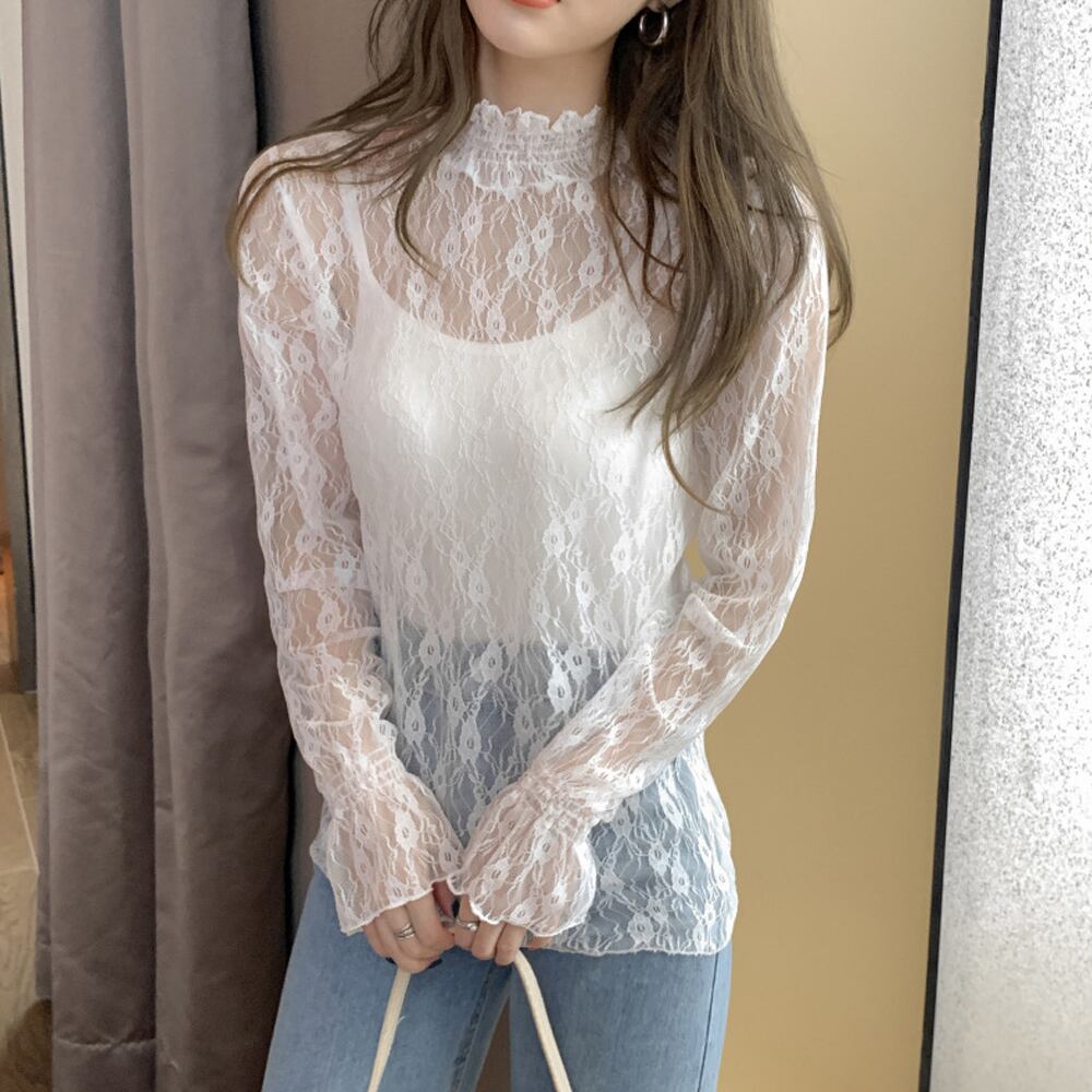 レース ブラウス レディース フリル シースルー トップス 花柄 プチハイネック きれいめ おしゃれ