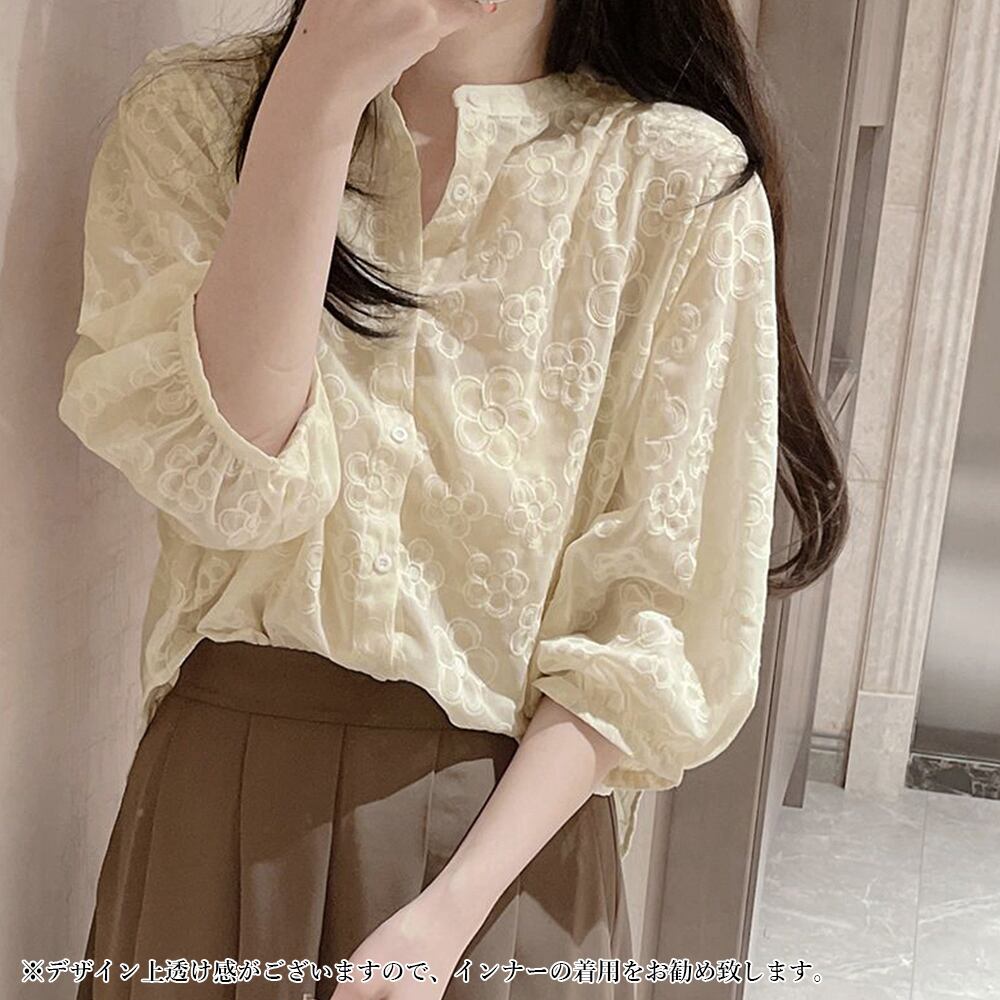 シアーなジャカードレースが印象的な存在感ある1枚に、ほのかな甘さをプラスするクラシカルな花柄刺しゅうブラウス