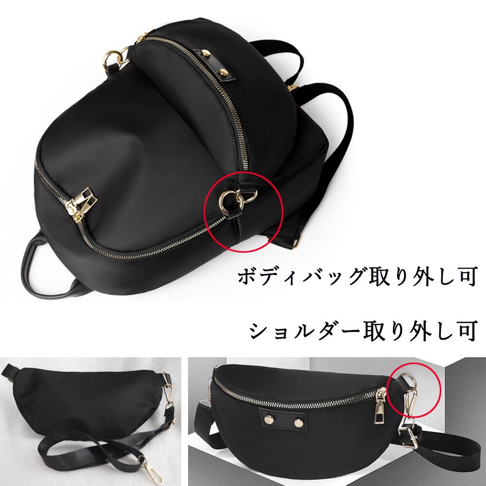 リュックバッグと同布のボディバッグが付いており、リュックと別々に使え、用途に合わせて活躍できる