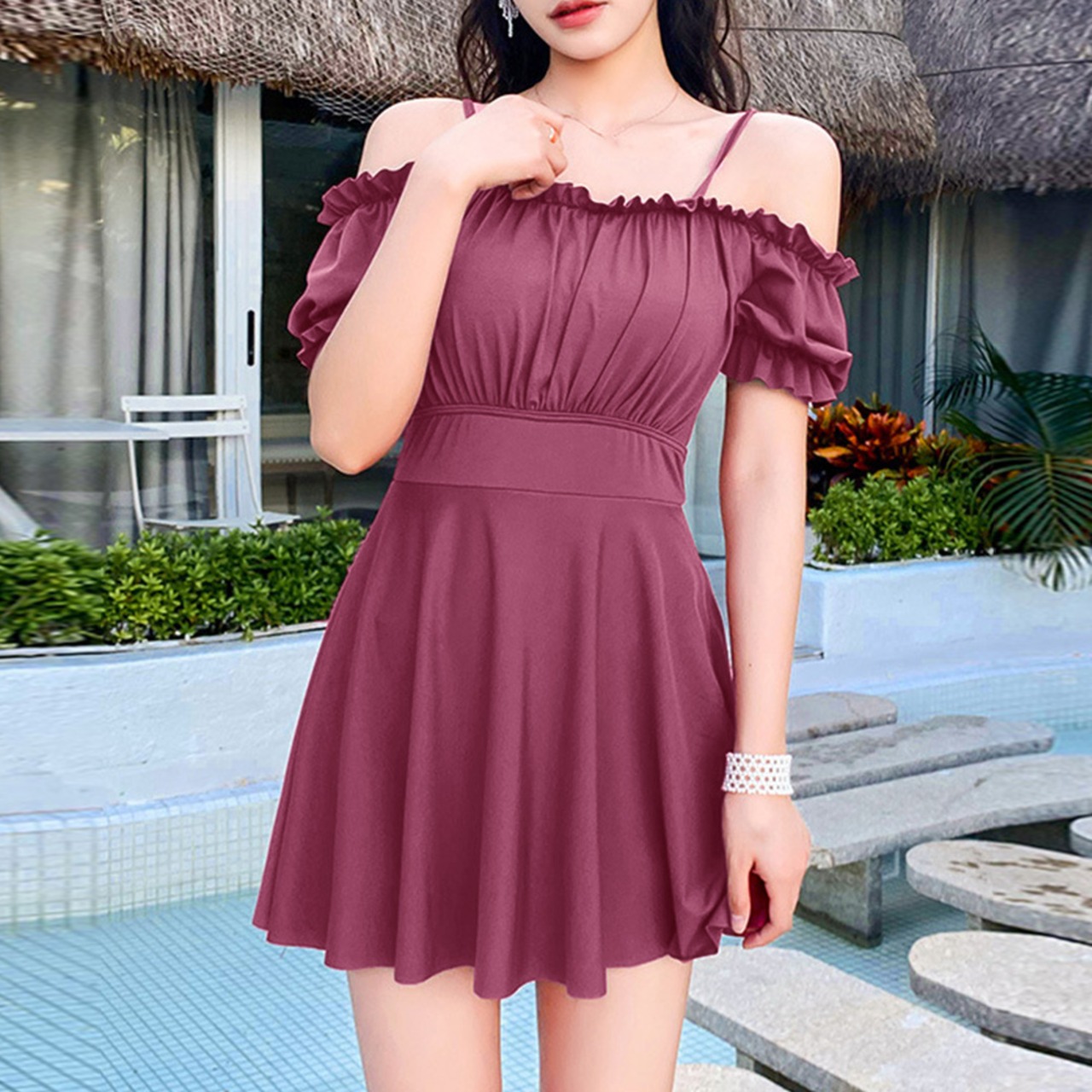 縦フリル付きで女性らしいオフショルダーワンピース水着