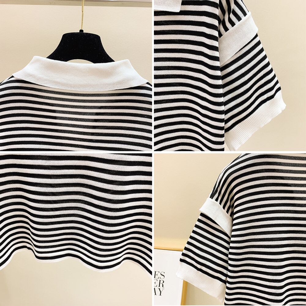 ニットtシャツ 薄手サマーニット 5分袖Vネック 襟付きカットソー ボーダー柄トップス 韓国ファッション カジュアル夏服