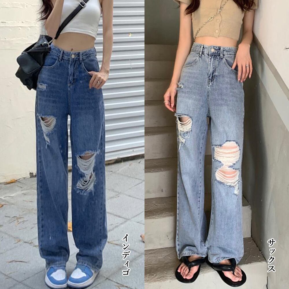 レディースのカッコいいスタイルを演出するクラッシュダメージデニムパンツです