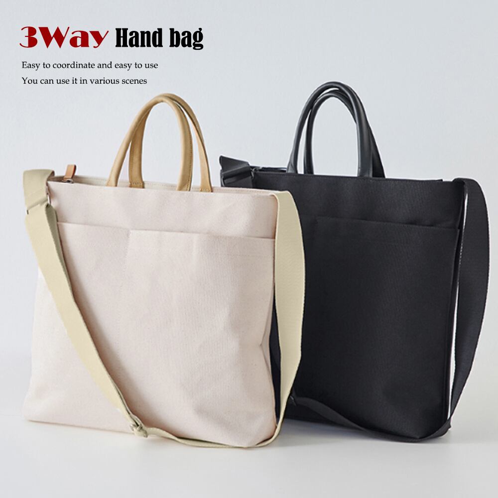 キャンバス生地にPUレザーのハンドル、2種類の素材を使用した3wayハンドバッグ