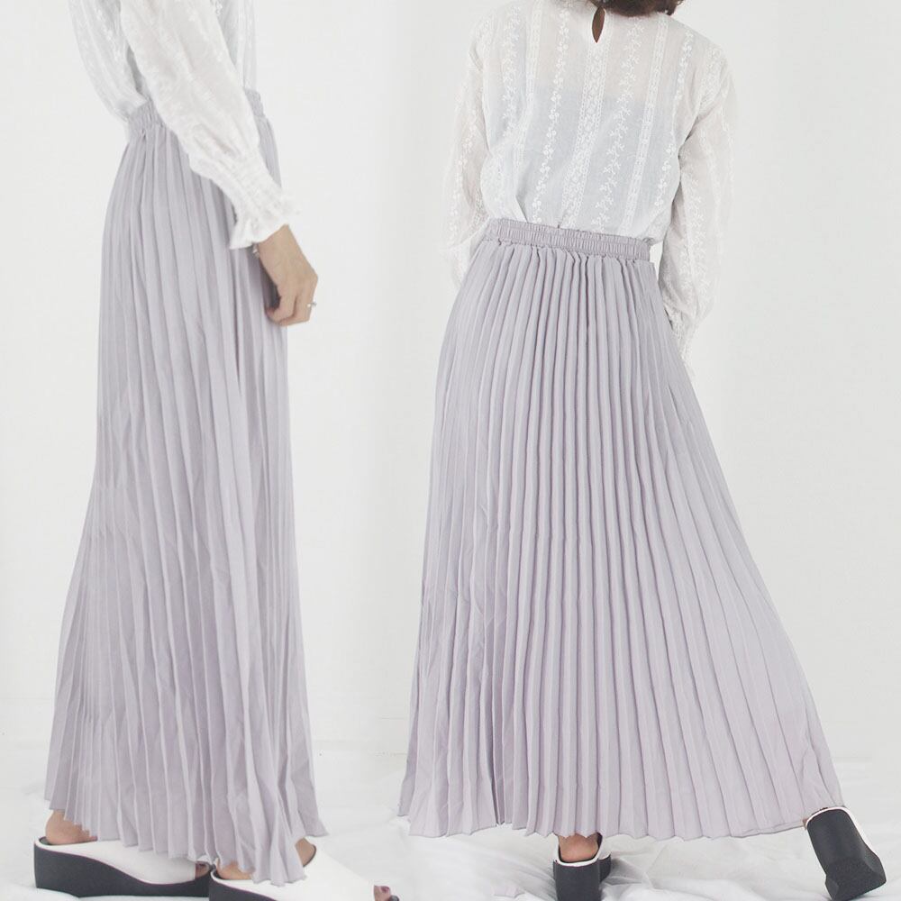 旬顔のプリーツ仕様はスタイルアップ効果があり細見えのロングスカート
