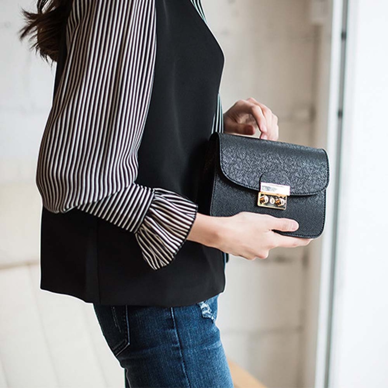 金具差し込み式のフラップ、マチが広めでコンパクトなお財布、スマートフォン、カードケース、メイク道具等が収納出来るのも魅力