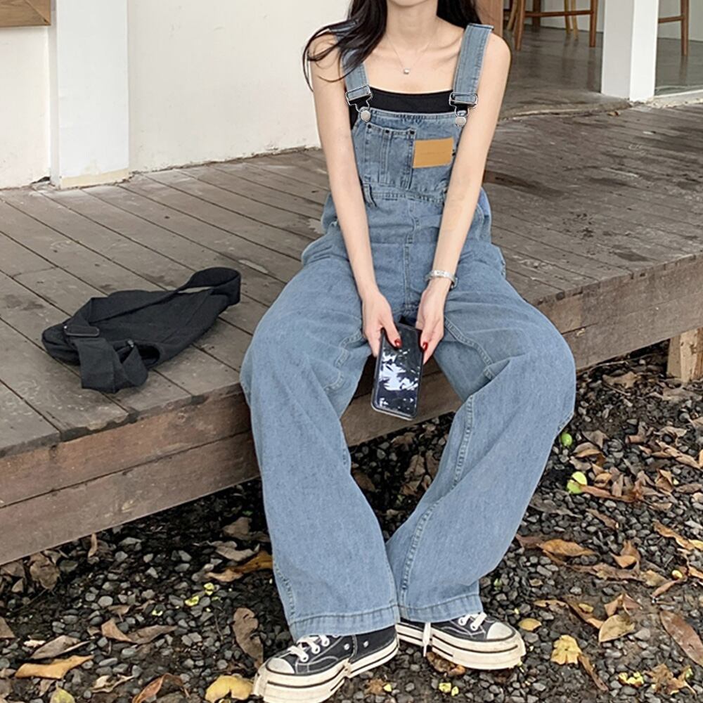ワイドストレートデニムオーバーオール レディース ロングパンツ カジュアル ジーンズ ゆったり レトロデニムパンツ 美脚