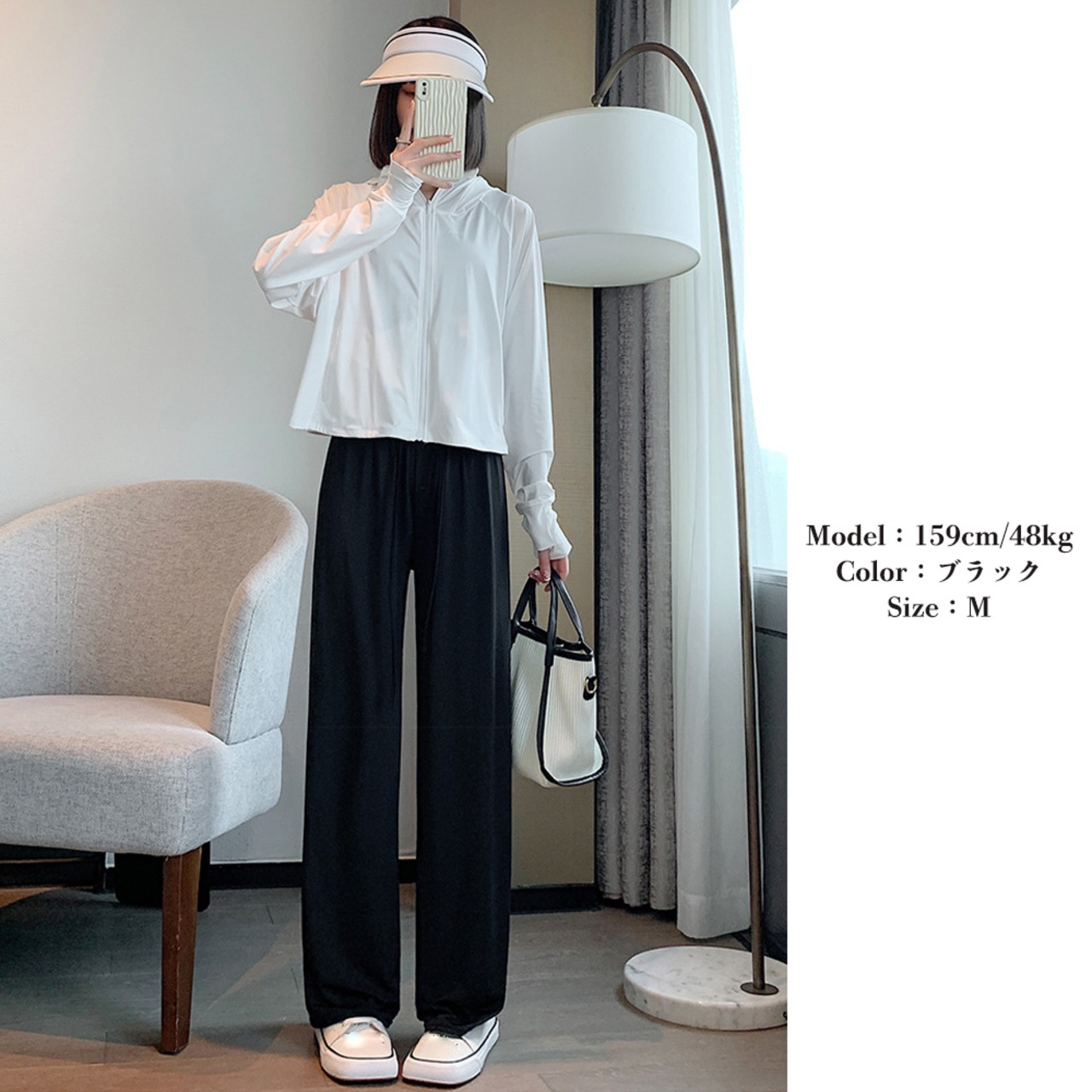 ワイドなシルエットがさりげなくレッグラインをカバーする。