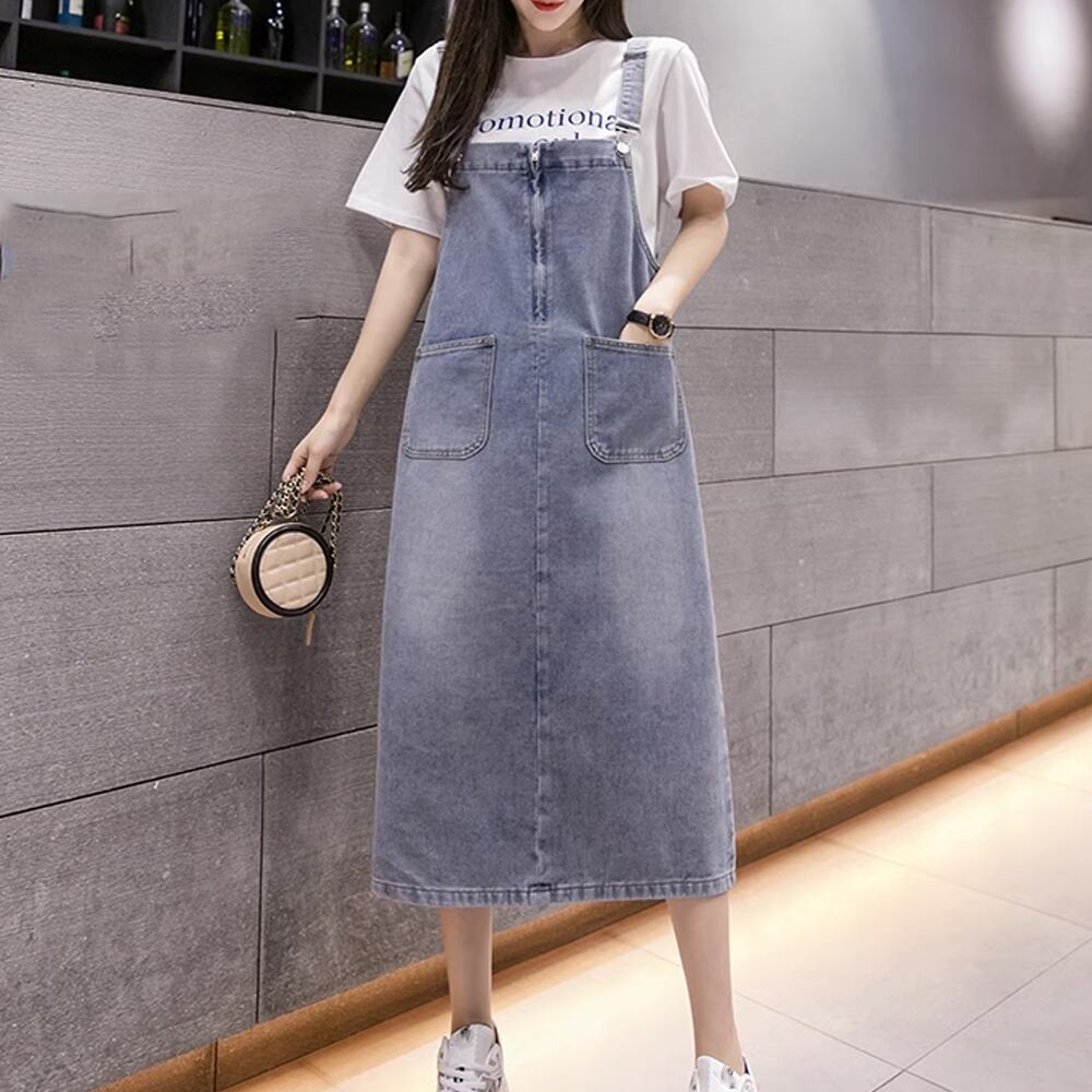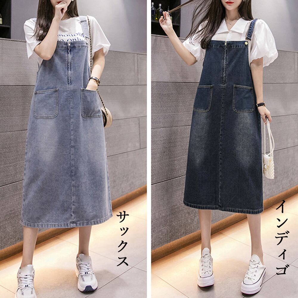 デニムワンピース スリット入り ワンピ ゆったり 体型カバー ポケット付き デニムジャンパースカート フロントファスナー