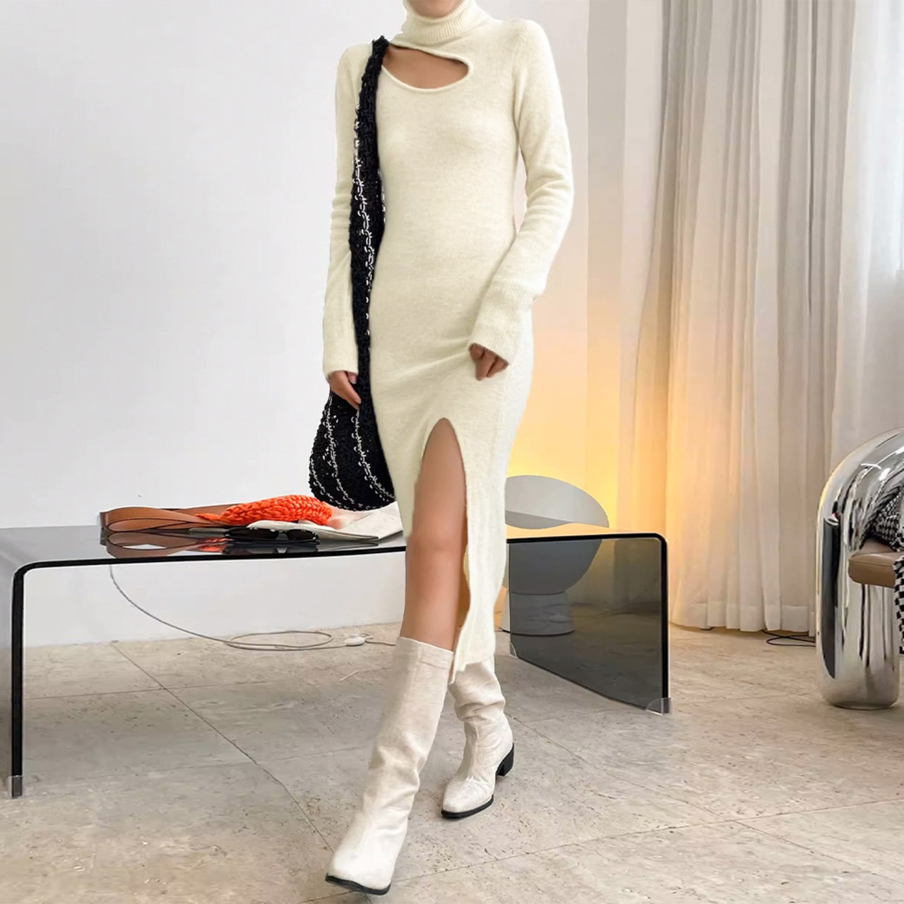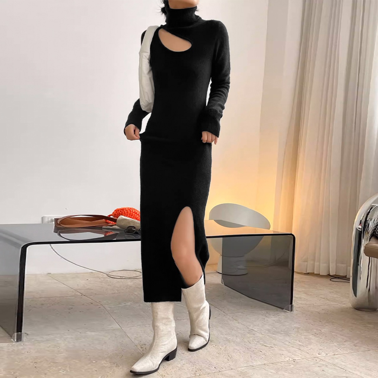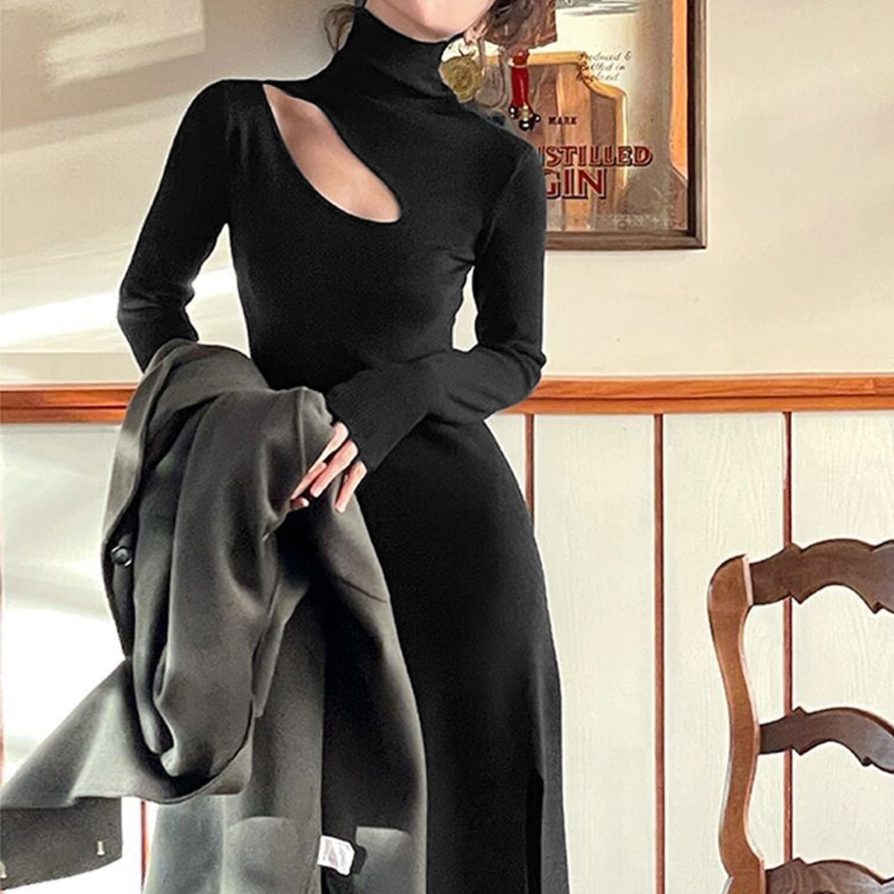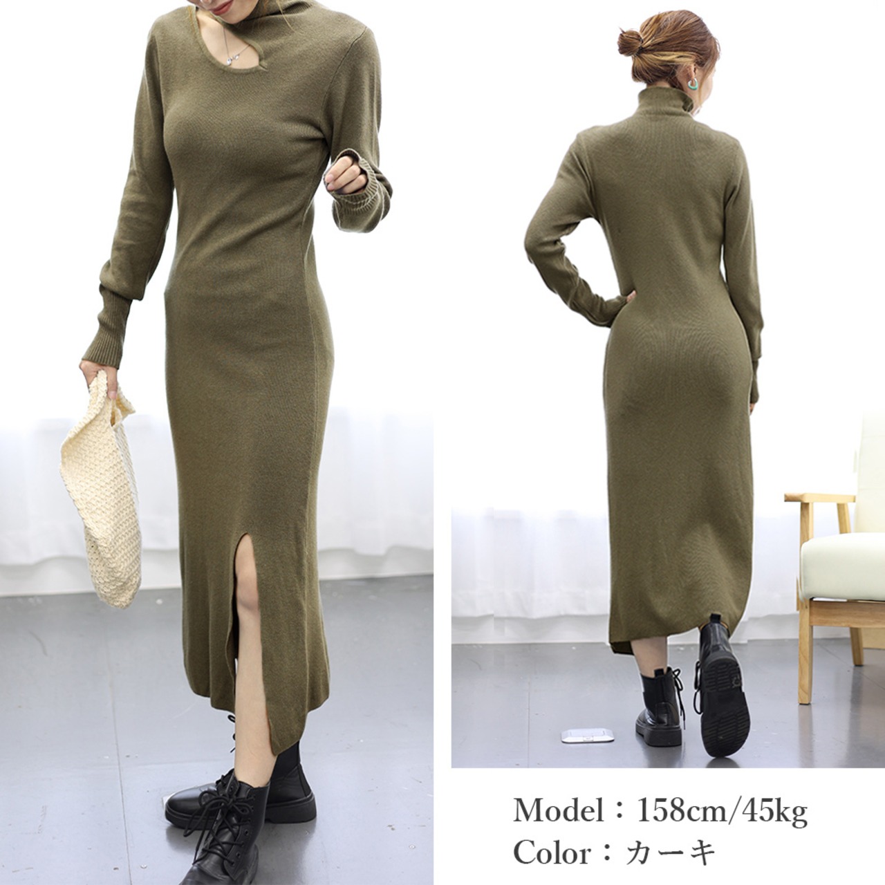 レディース カットアウト ロングワンピース タートルネック タイトワンピース秋冬 きれいめ長袖 セクシーボディコンワンピ