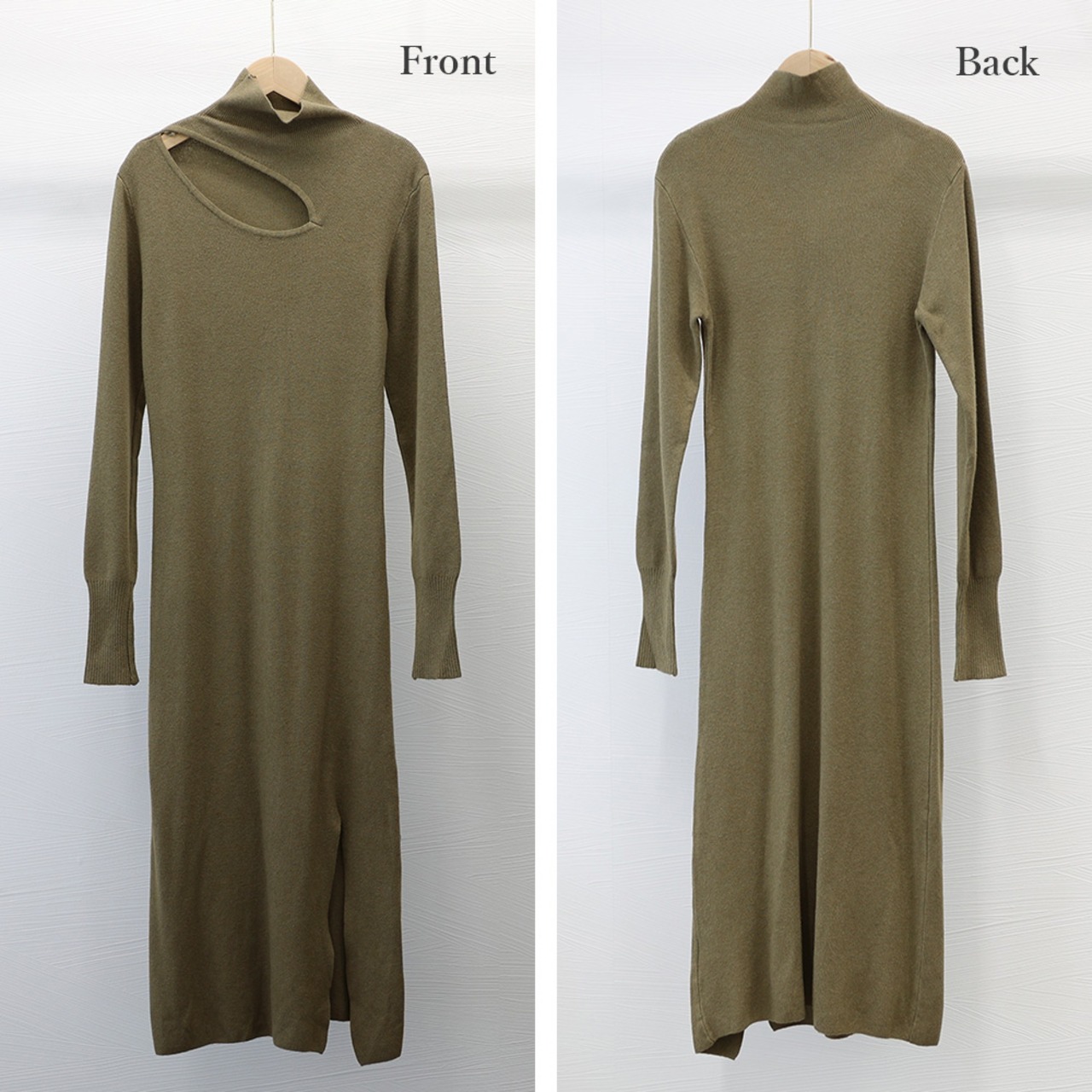 女性らしいタイトなシルエットがボディラインを美しく描いてくれる韓国新作DESIGNのタートルネックロングワンピース