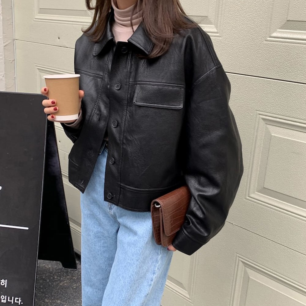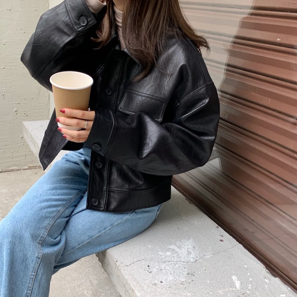 レディース オーバーサイズ フェイクレザージャケット ショート丈 長袖アウター 体型カバー かっこいいブルゾン 韓国秋冬