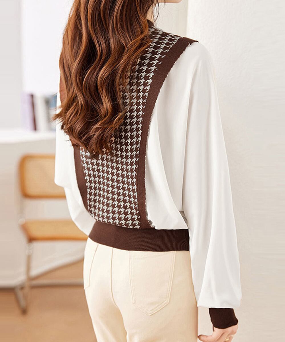 レディース 切り替えニットトップス バルーンスリーブ 韓国風 千鳥格子 ニットプルオーバー カジュアル ニットブラウス
