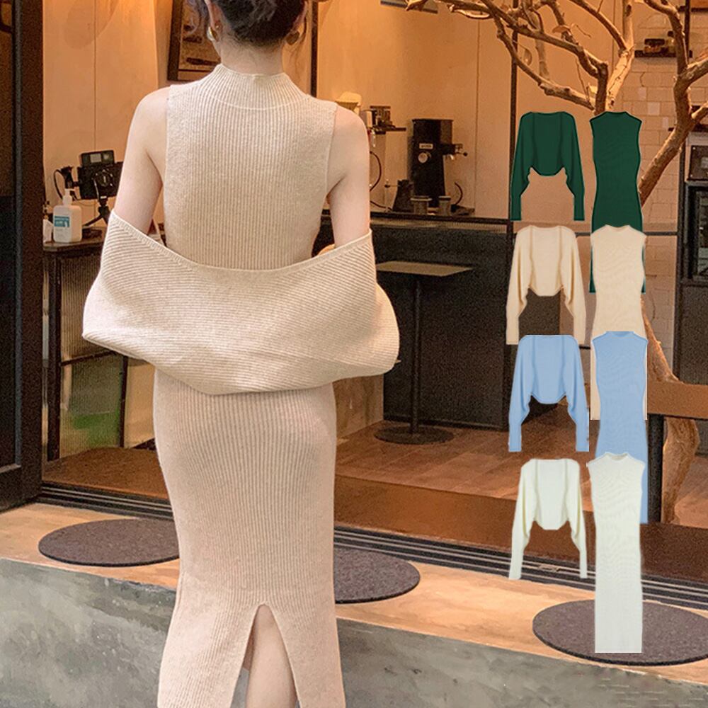 フェミニン 秋冬ロングワンピース ボレロカーディガン セットアップ きれいめ 韓国 無地タイトワンピース バックスリット