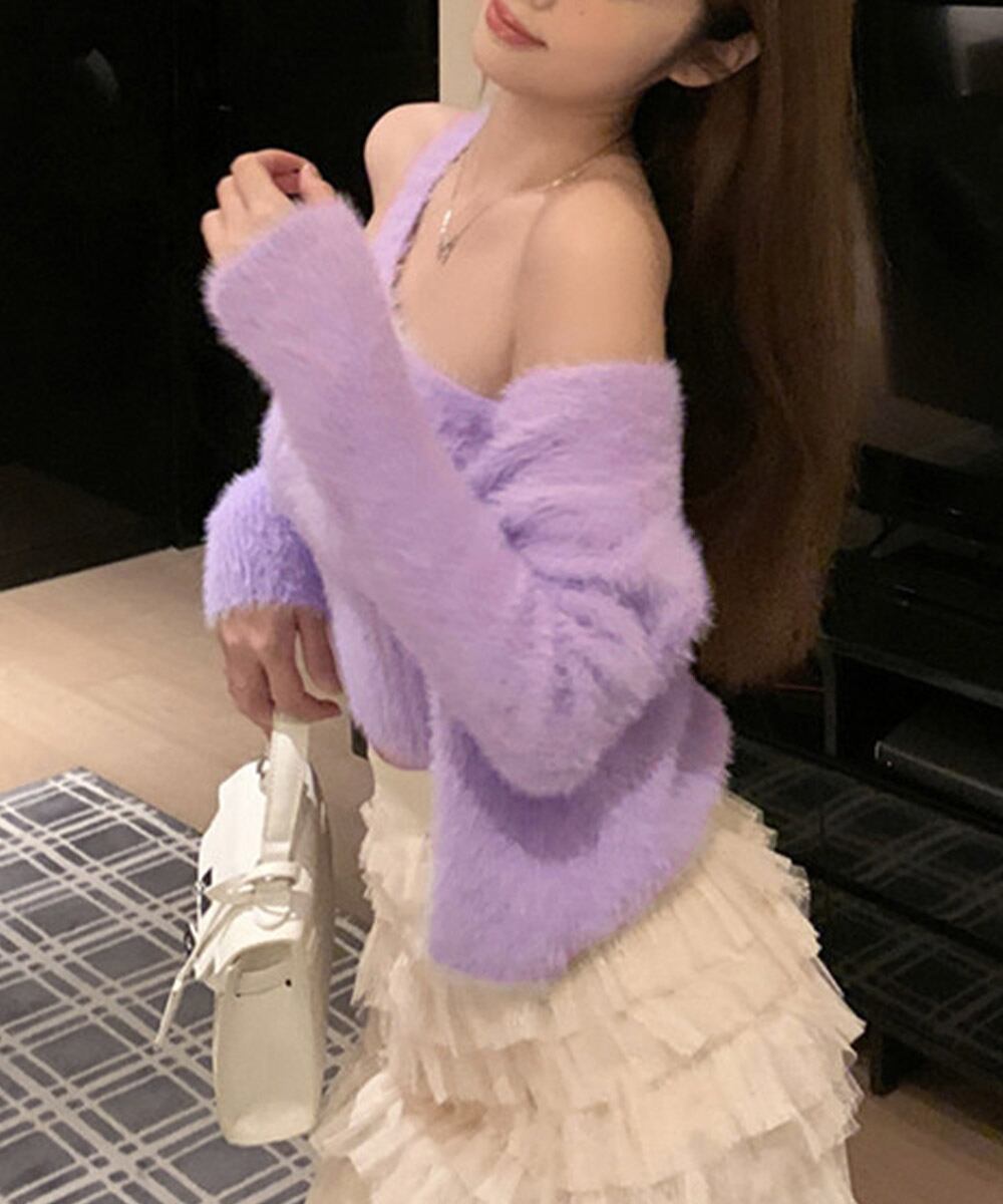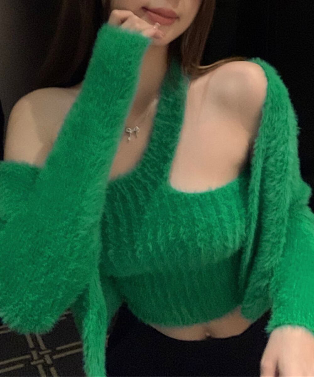 ふわふわ モヘアニットセットアップ セクシー ショート丈カーディガン ニットビスチェ おしゃれミンクファートップス 秋冬