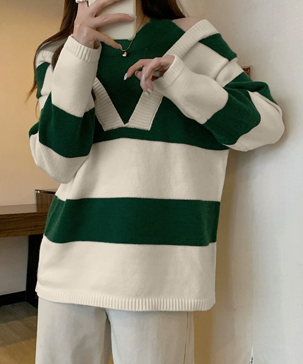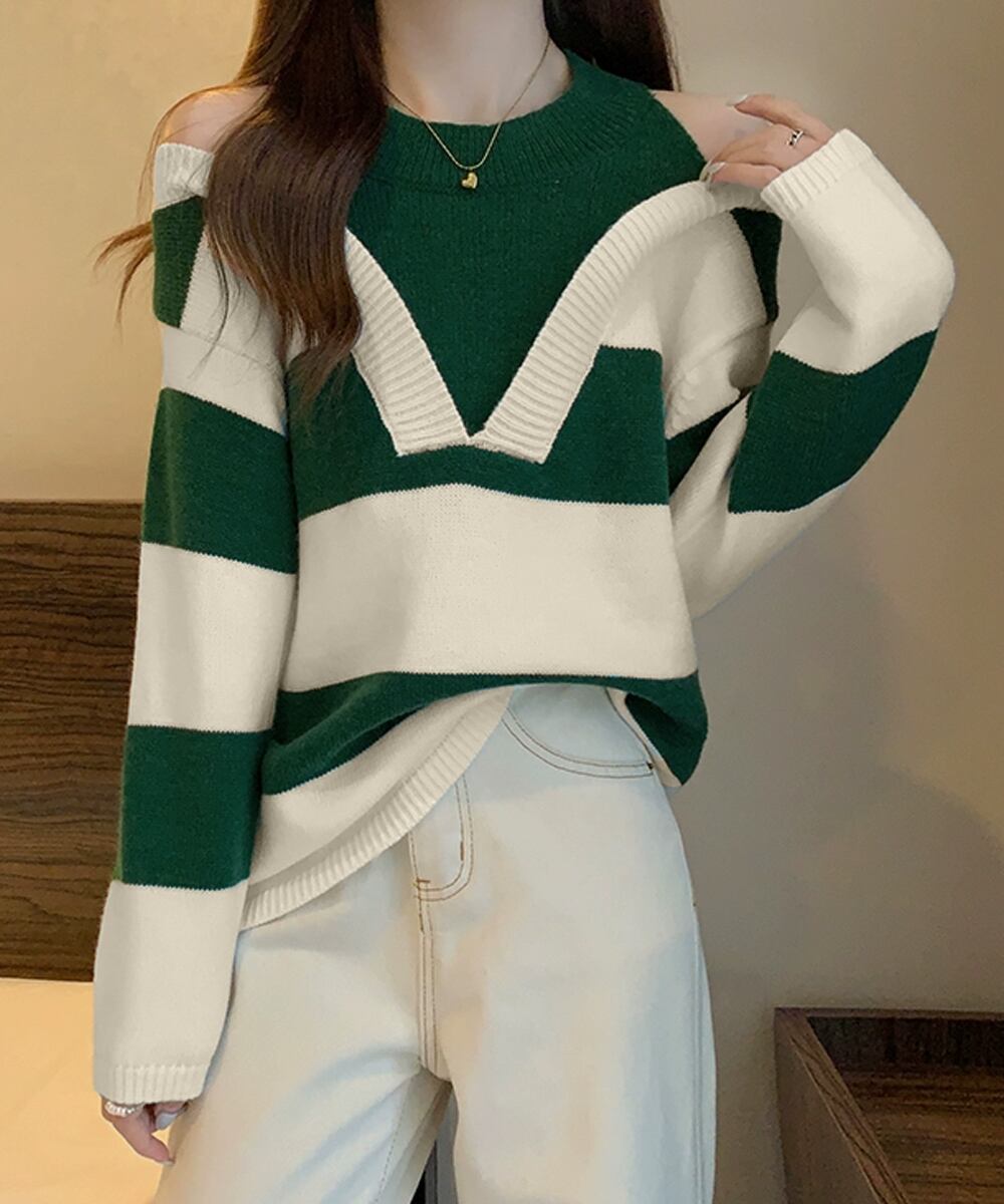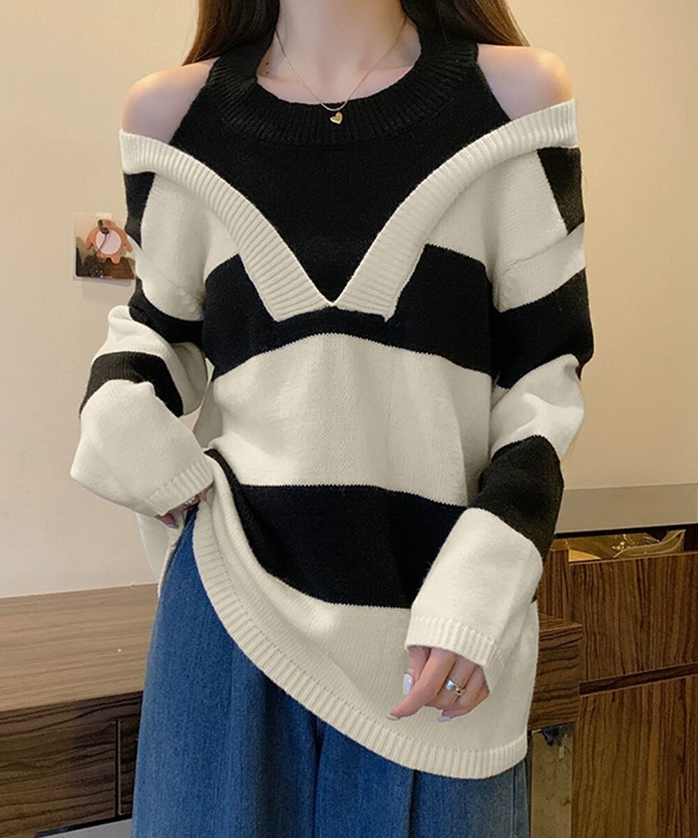 肩開き ニットプルオーバー レディース レイヤード風 ニットセーター 重ね着風ニットトップス 肌見せトップス バイカラー