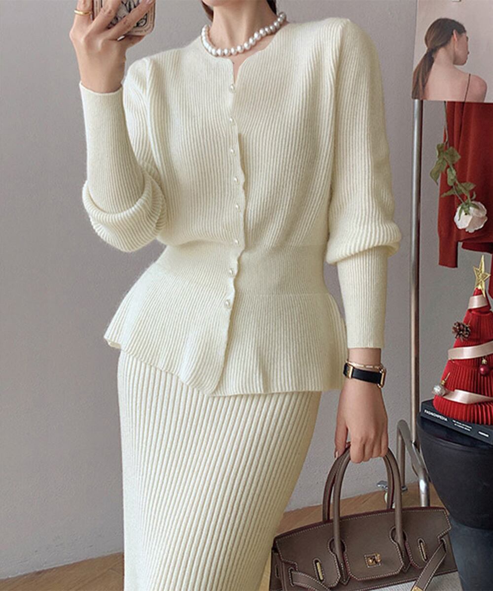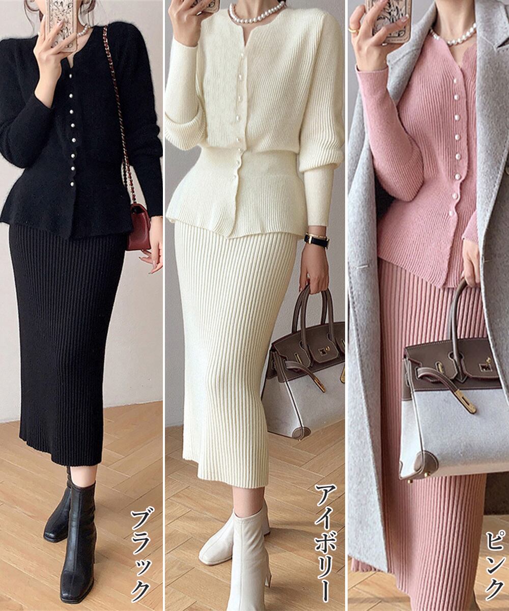 アンサンブルニット ペプラムカーディガン ウエストマークニットトップス リブニットスカートスリット ロングスカート着やせ