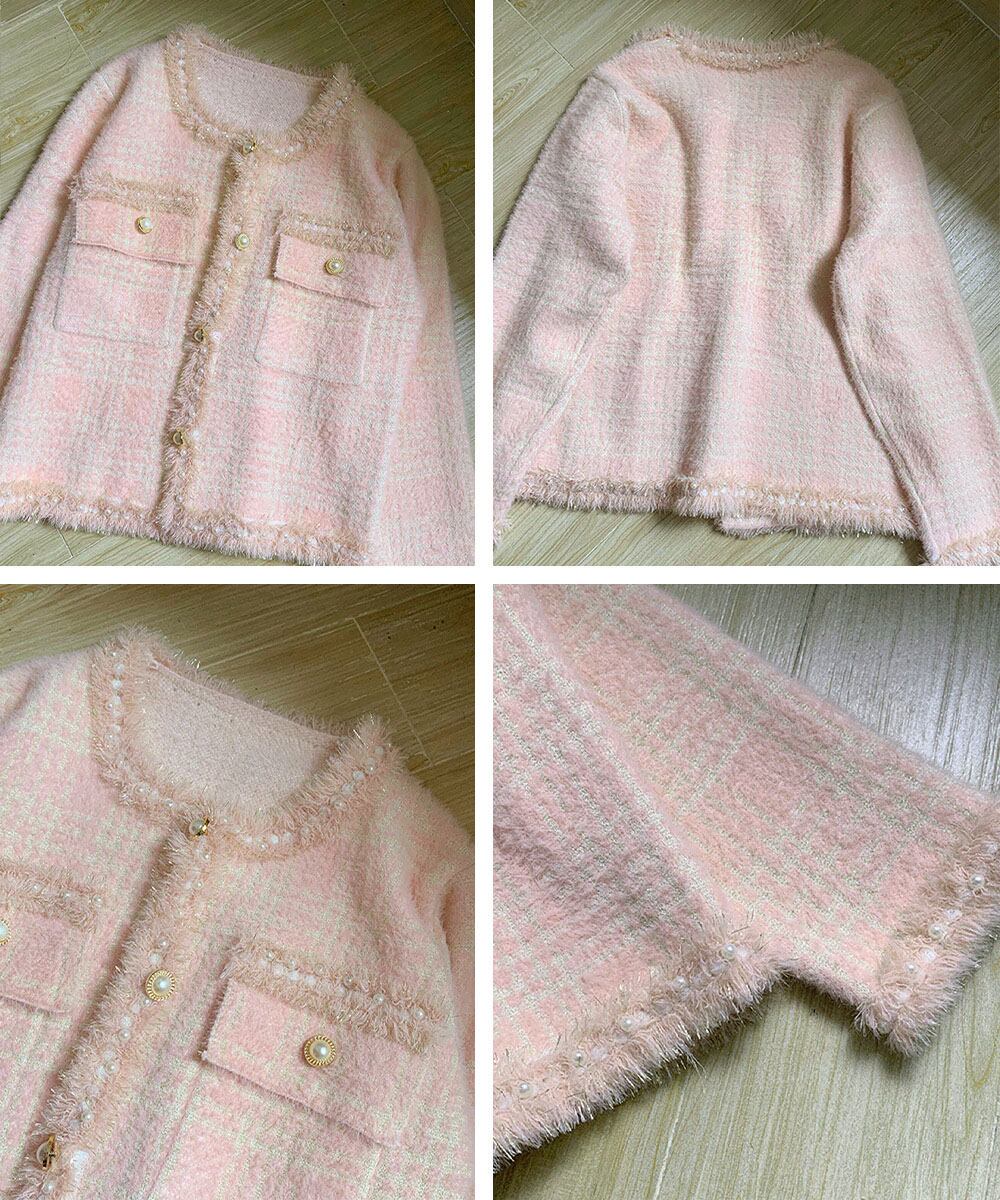 ラメ糸を織り込んでいるので上品な輝きを放ち、縁にあしらったフリンジとフェイクパールボタンは清楚女子のフェミニンテイストをPLUS